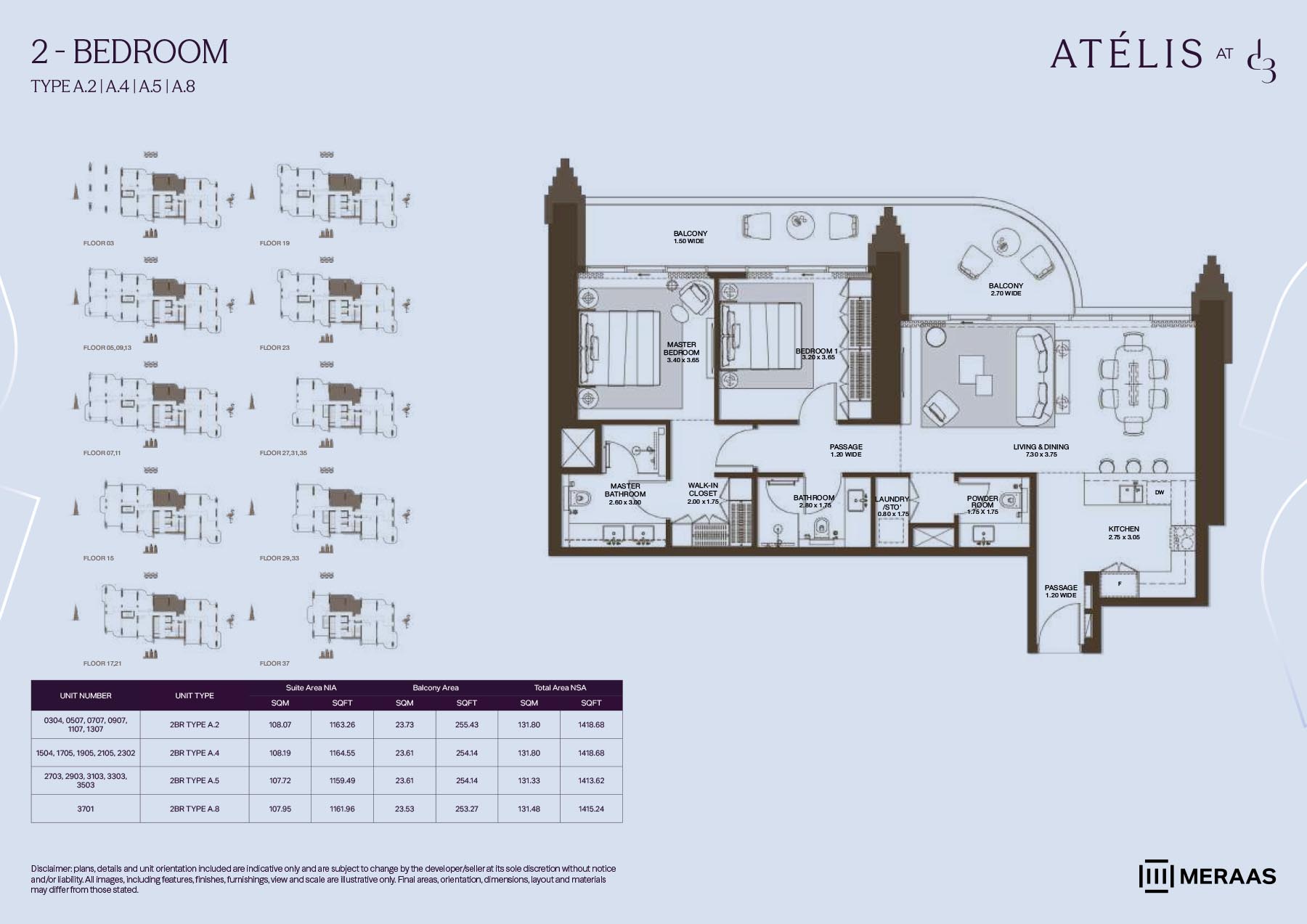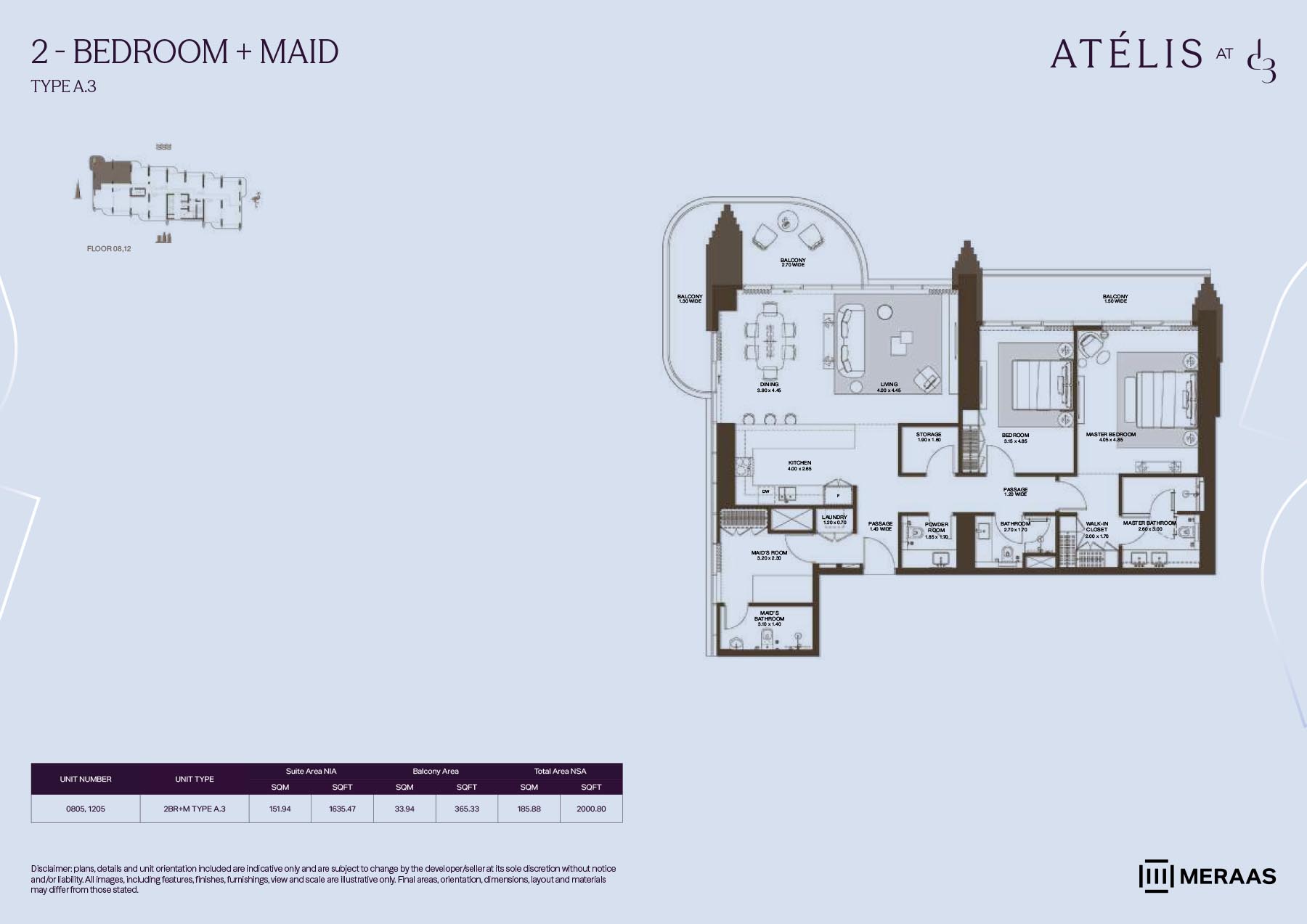 | Floor 08 & 12 | 2 Bedrooms + Maid | Type A3 (Unit 0805 & 1205) | 2000.80 Sq Ft | Apartments |