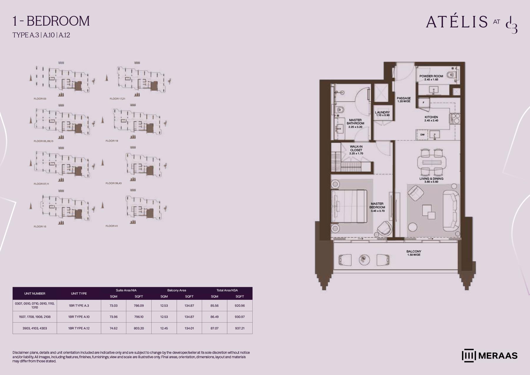 | Floor 03-43 | 1 Bedroom | Type A3-A12 (Unit 0307-4303) | 937.21 Sq Ft | Apartments |