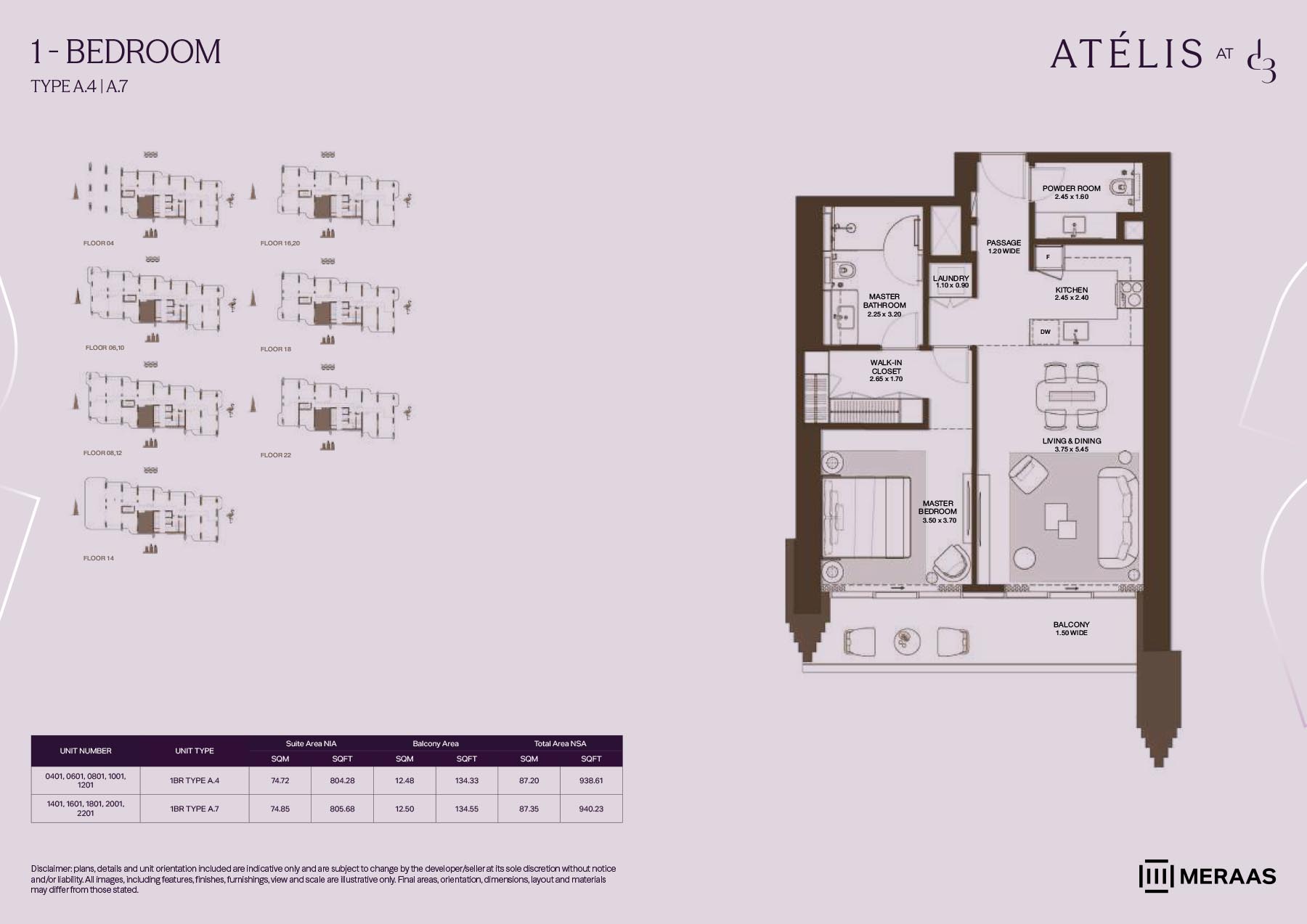 | Floor 04-22 | 1 Bedroom | Type A4-A7 (Unit 0401-2201) | 940.23 Sq Ft | Apartments |