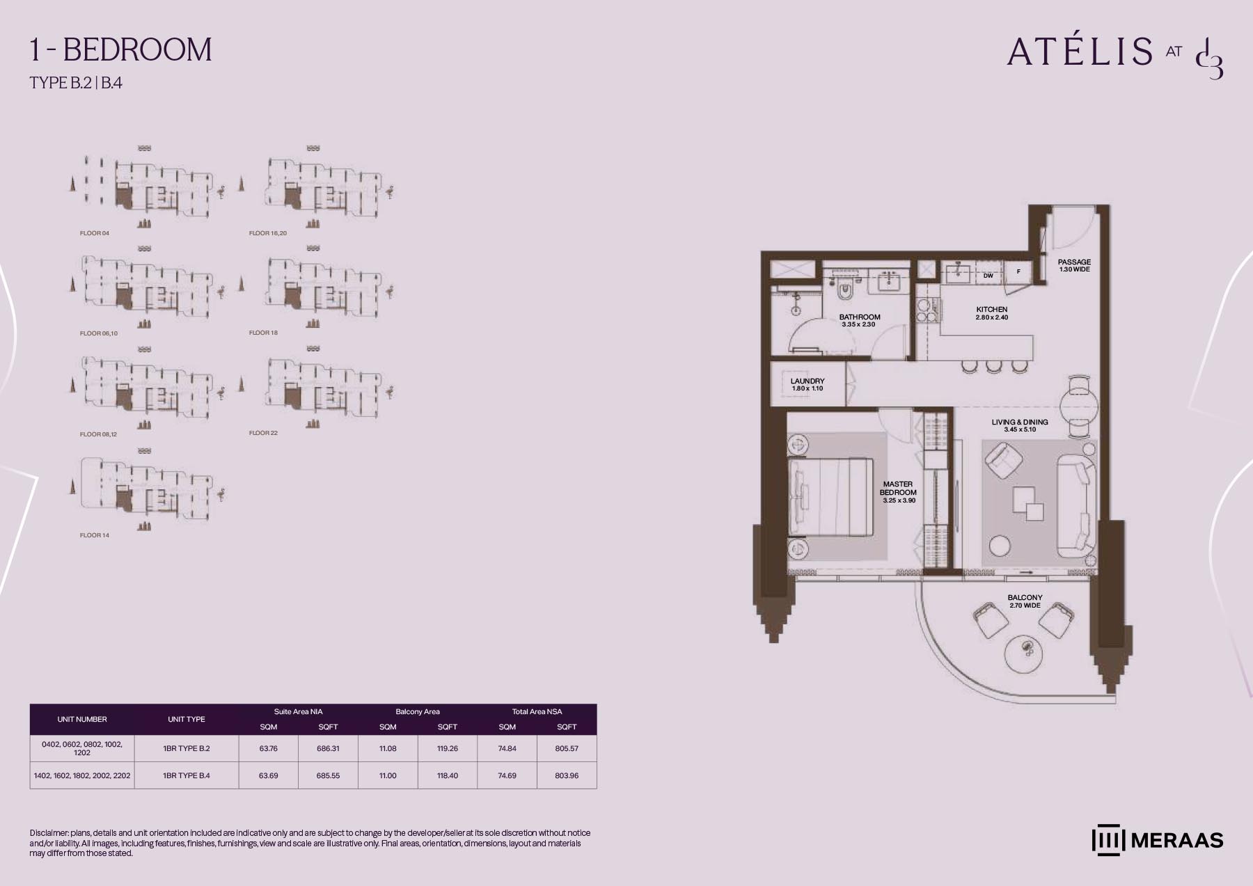 | Floor 04-22 | 1 Bedroom | Type B2-B4 (Unit 0402-2202) | 805.57 Sq Ft | Apartments |