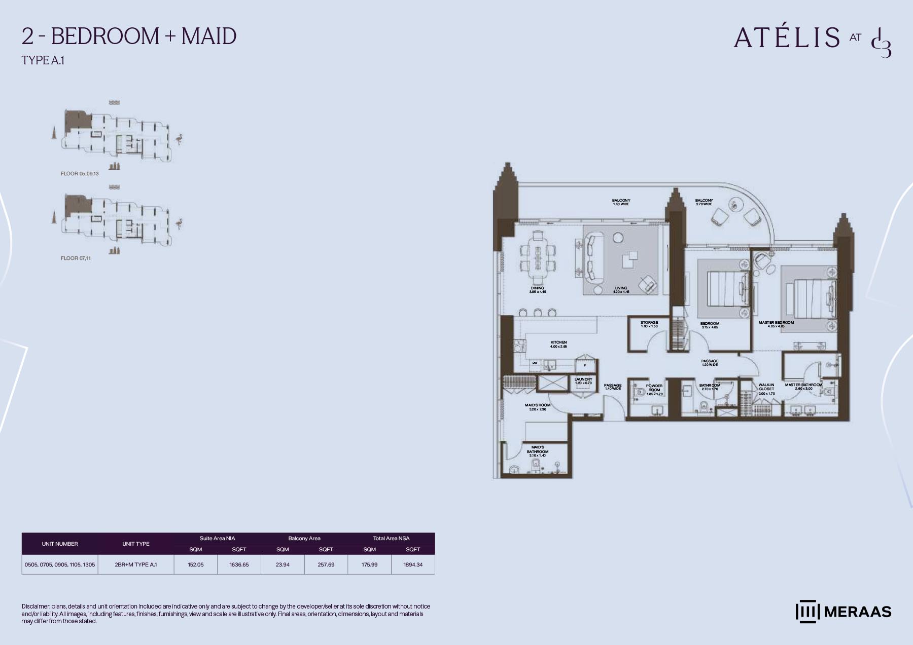 | Floor 05-11 | 2 Bedrooms + Maid | Type A1 (Unit 0505-1305) | 1894.34 Sq Ft | Apartments |