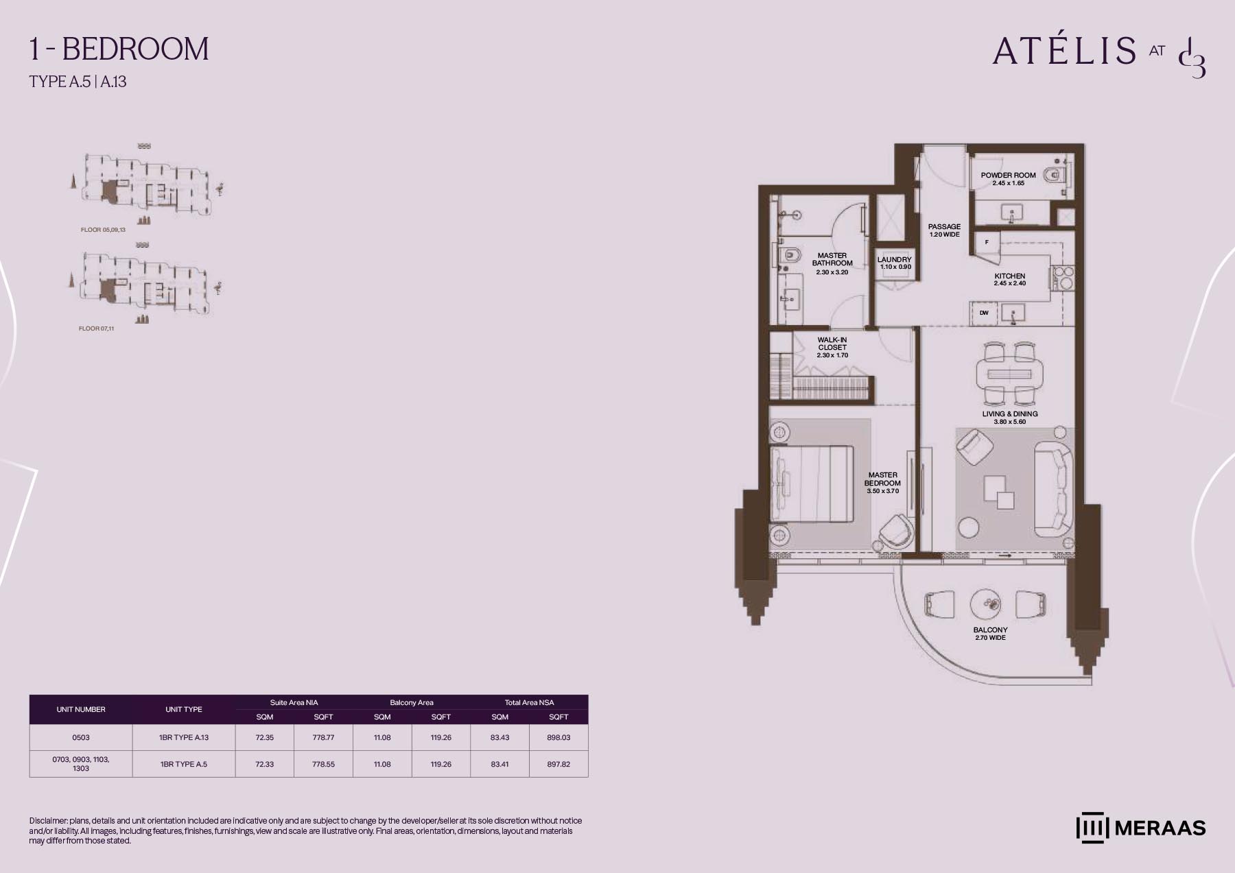| Floor 05-13 | 1 Bedroom | Type A5-A13 (Unit 0503-1303) | 898.03 Sq Ft | Apartments |