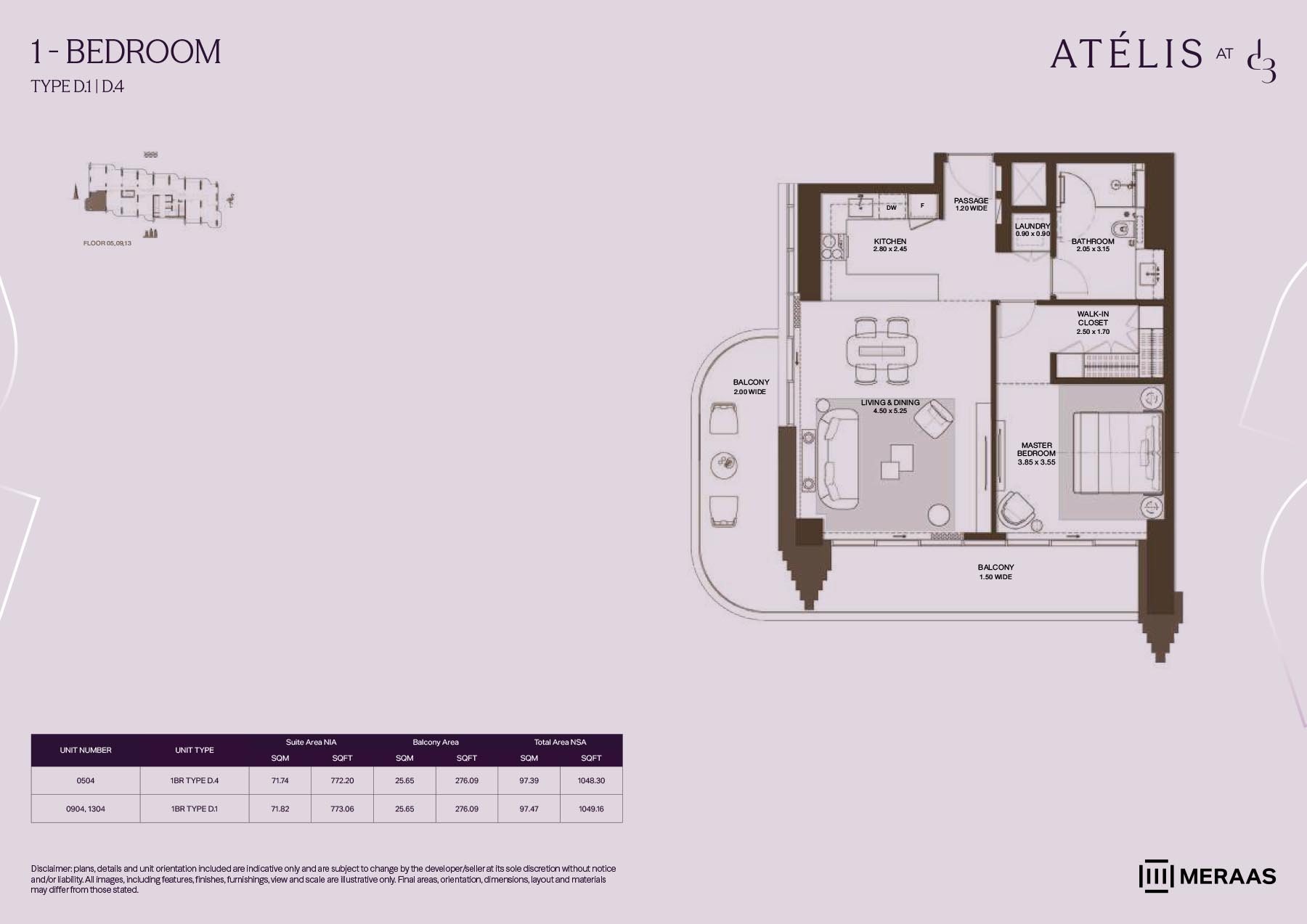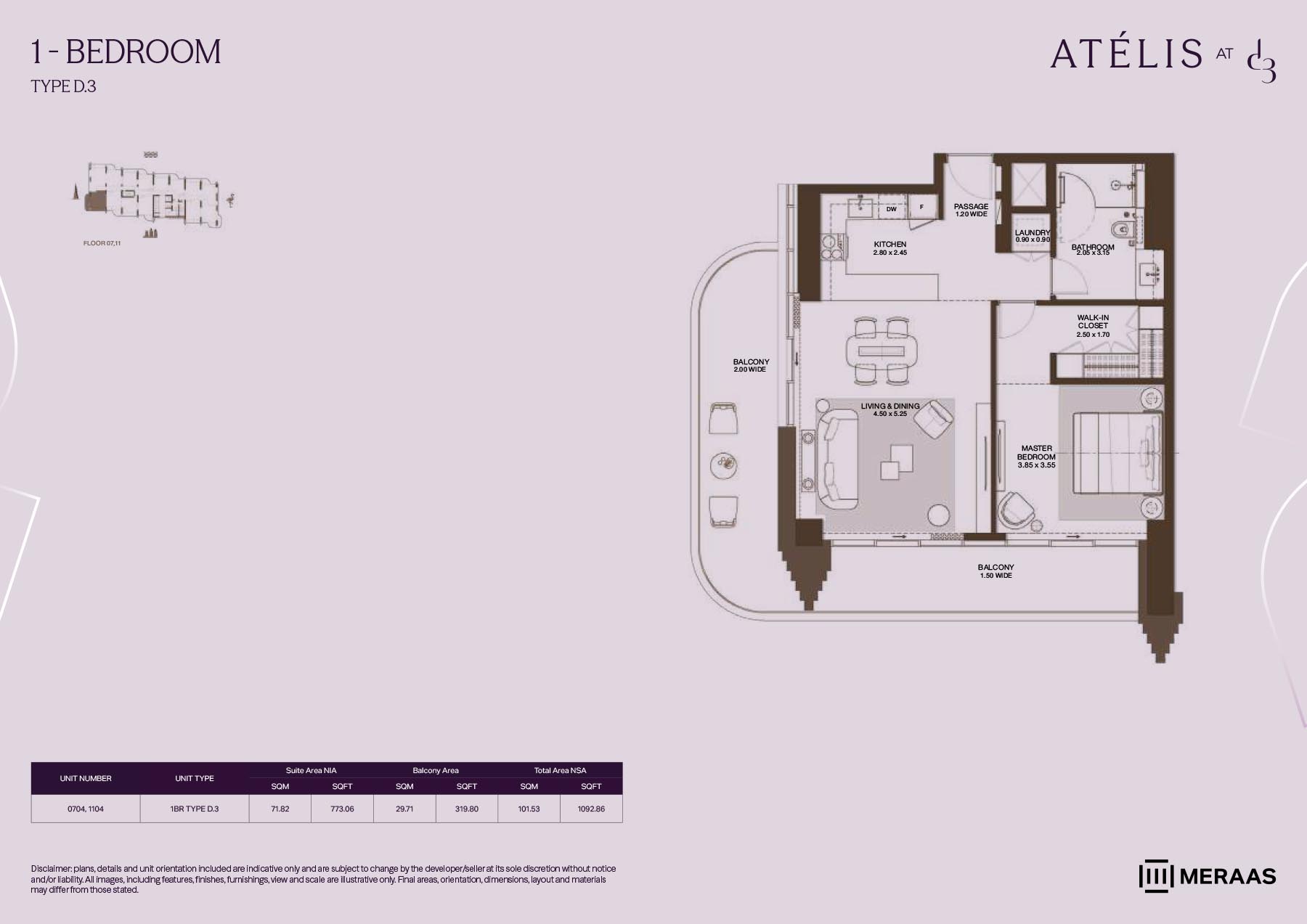 | Floor 07 & 11 | 1 Bedroom | Type D3 (Unit 0704 & 1104) | 1092.86 Sq Ft | Apartments |