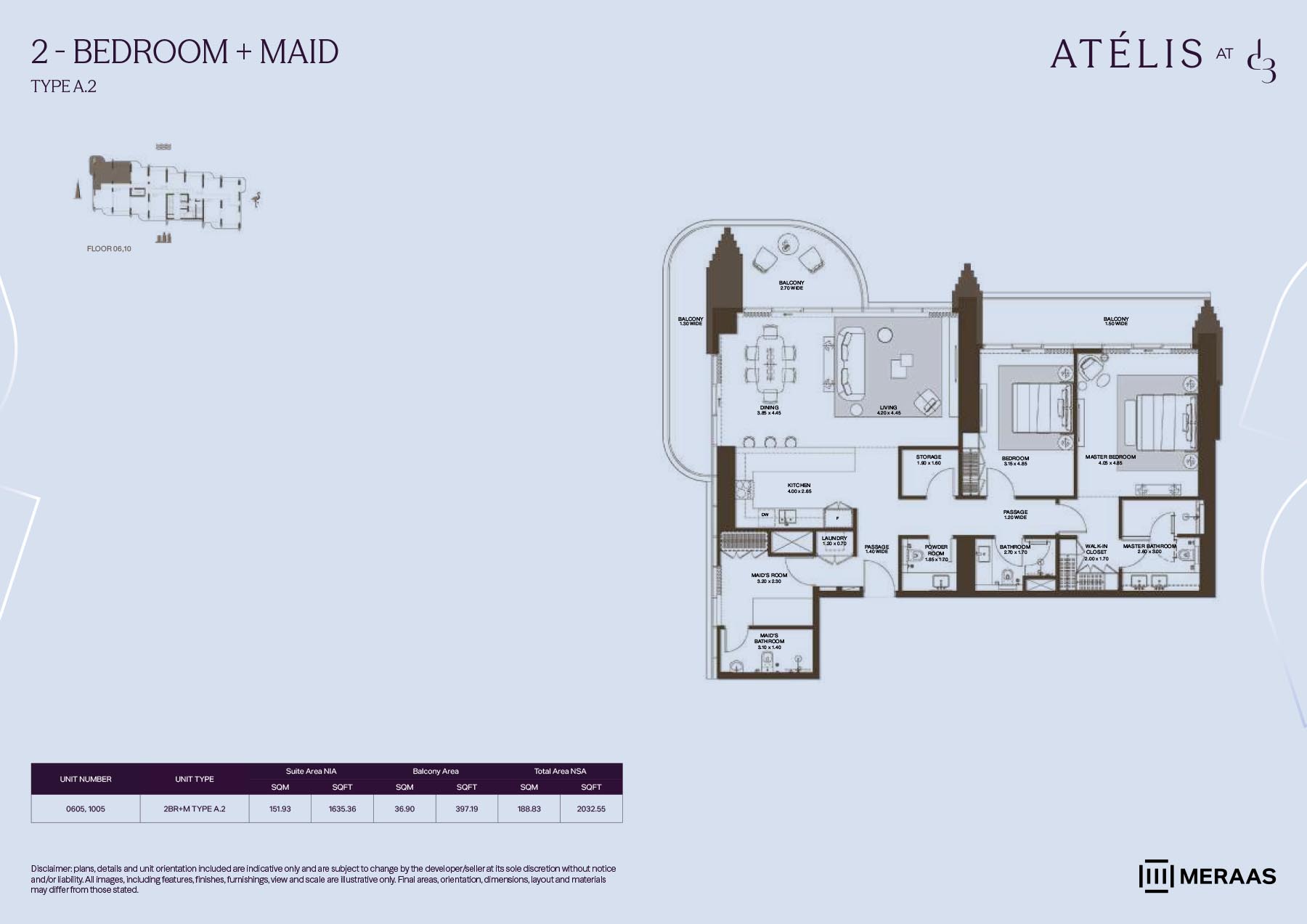 | Floor 06 & 10 | 2 Bedrooms + Maid | Type A2 (Unit 0605 & 1005) | 2032.55 Sq Ft | Apartments |