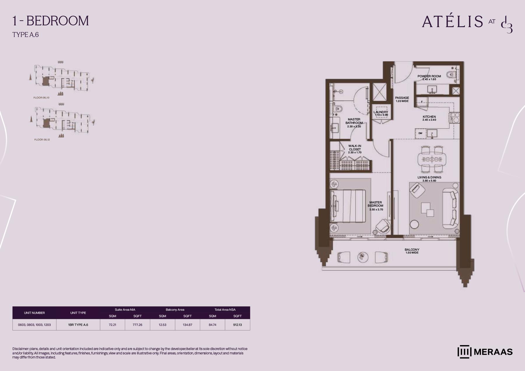 | Floor 06-12 | 1 Bedroom | Type A6 (Unit 0603-1203) | 912.13 Sq Ft | Apartments |