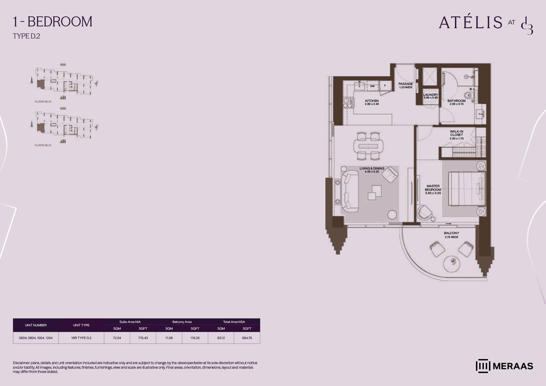 | Floor 06-12 | 1 Bedroom | Type D2 (Unit 0604-1204) | 894.70 Sq Ft | Apartments |