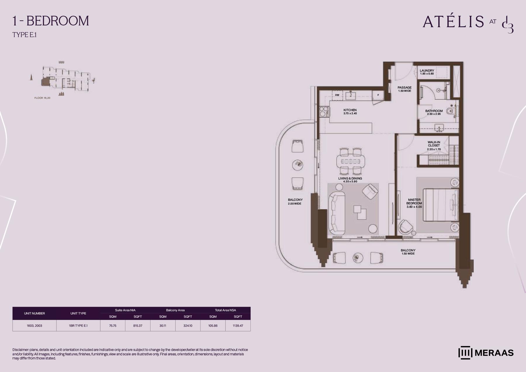 | Floor 16 & 20 | 1 Bedroom | Type E1 (Unit 1603 & 2003) | 1139.47 Sq Ft | Apartments |