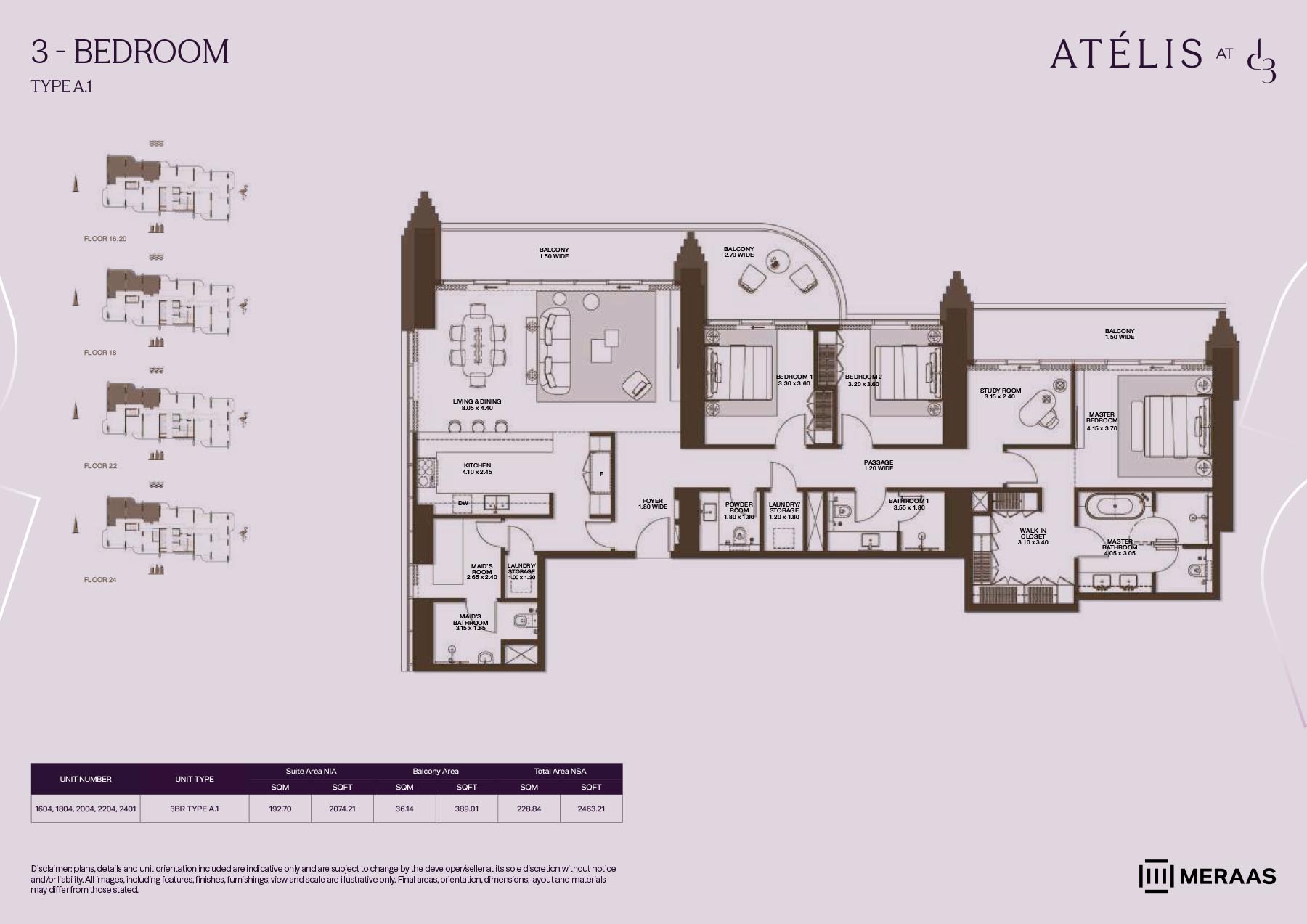 | Floor 16-24 | 3 Bedrooms + Study + Maid | Type A1 (Unit 1604-2401) | 2463.21 Sq Ft | Apartments |