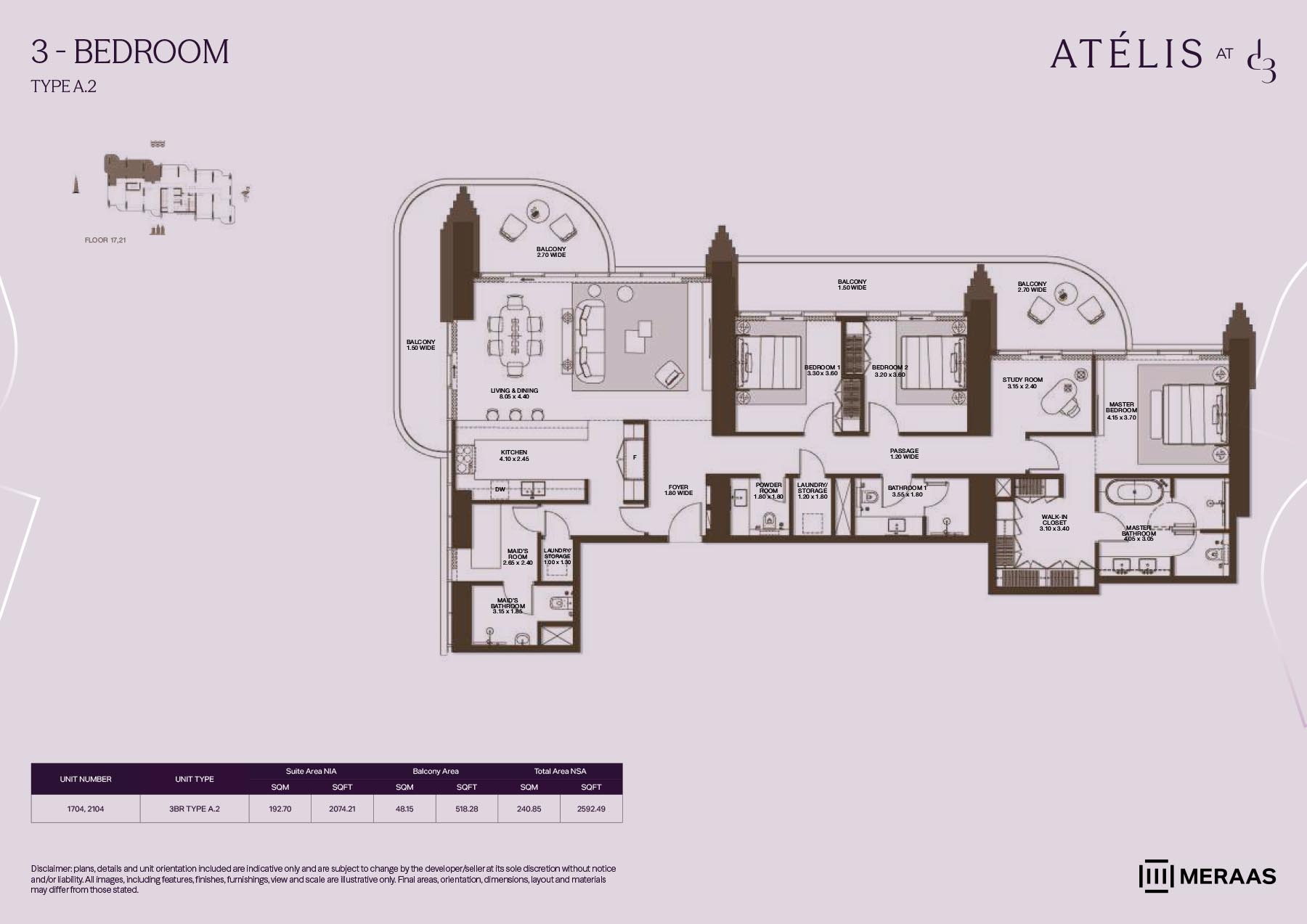 | Floor 17 & 21 | 3 Bedrooms + Study + Maid | Type A2 (Unit 1704 & 2104) | 2592.49 Sq Ft | Apartments |