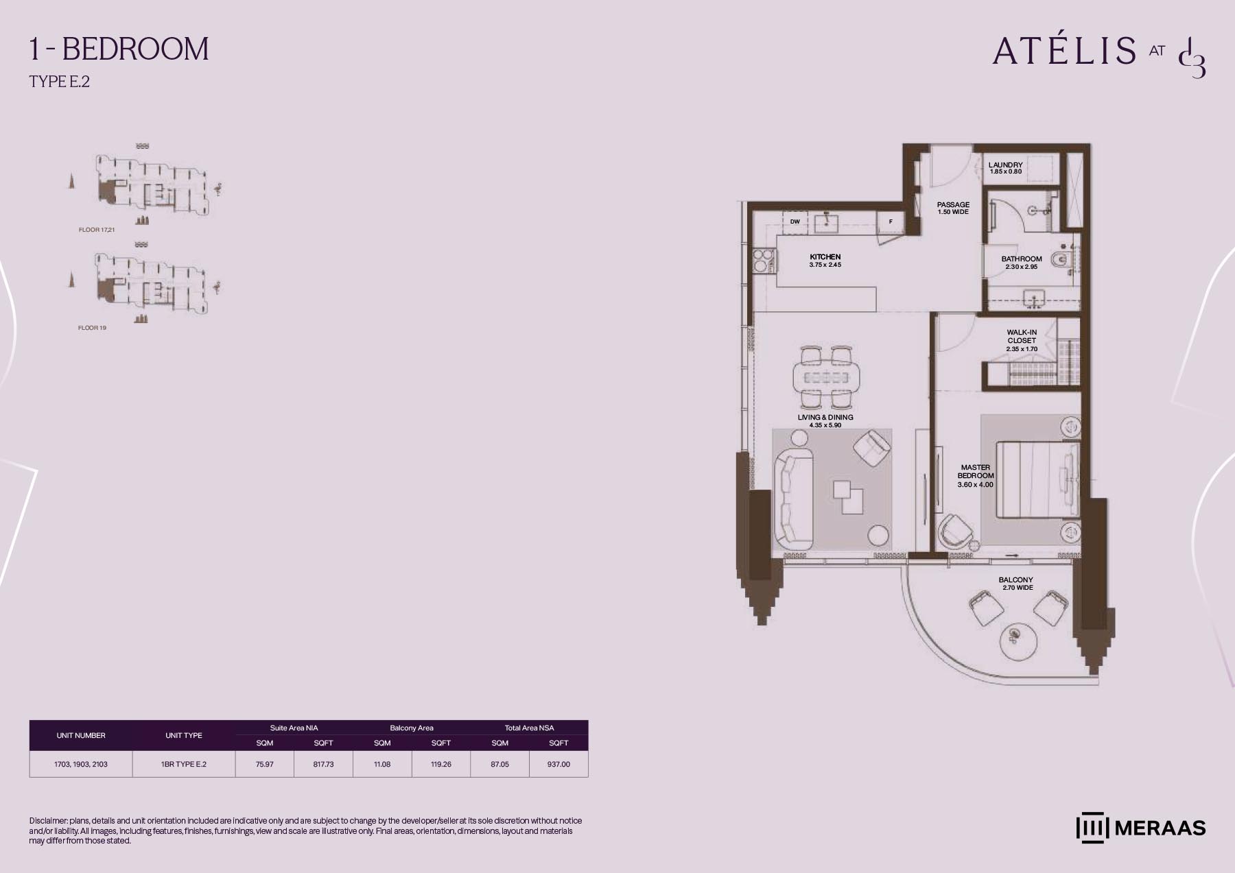| Floor 17-21 | 1 Bedroom | Type E2 (Unit 1703-2103) | 937.00 Sq Ft | Apartments |