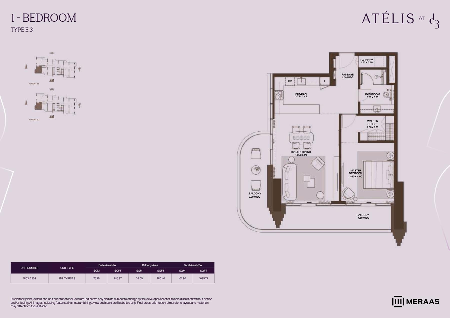 | Floor 18 & 22 | 1 Bedroom | Type E3 (Unit 1803 & 2203) | 1095.77 Sq Ft | Apartments |