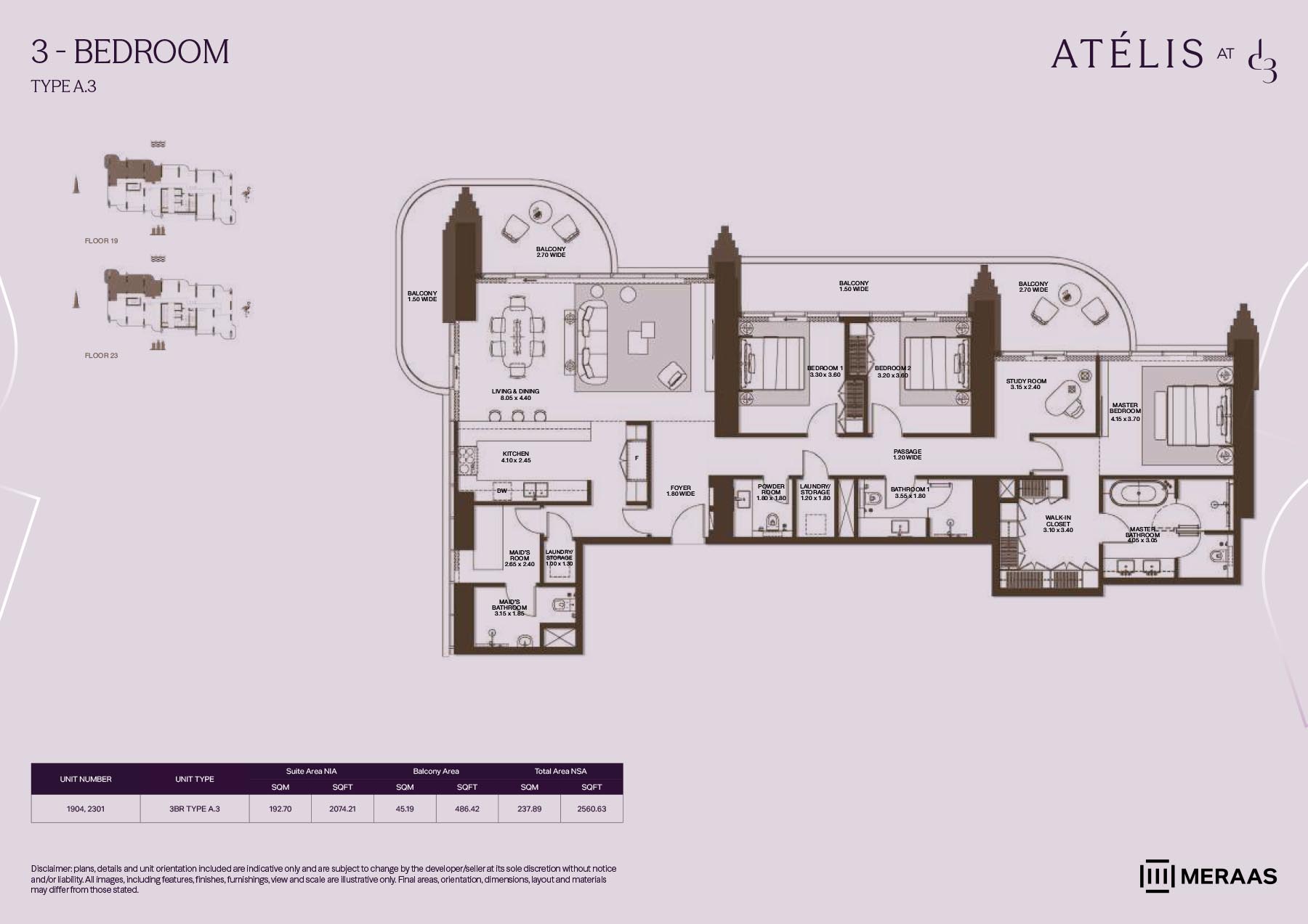 | Floor 19 & 23 | 3 Bedrooms + Study + Maid | Type A3 (Unit 1904 & 2301) | 2560.63 Sq Ft | Apartments |