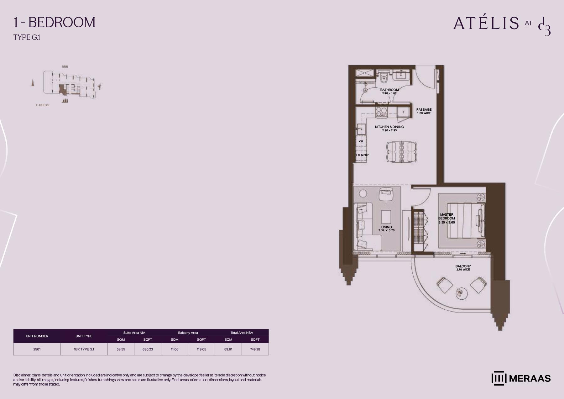 | Floor 25 | 1 Bedroom | Type G1 (Unit 2501) | 749.28 Sq Ft | Apartments |