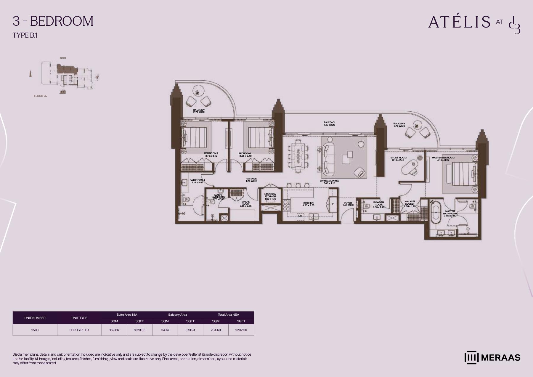 | Floor 25 | 3 Bedrooms + Study + Maid | Type B1 (Unit 2503) | 2202.30 Sq Ft | Apartments |