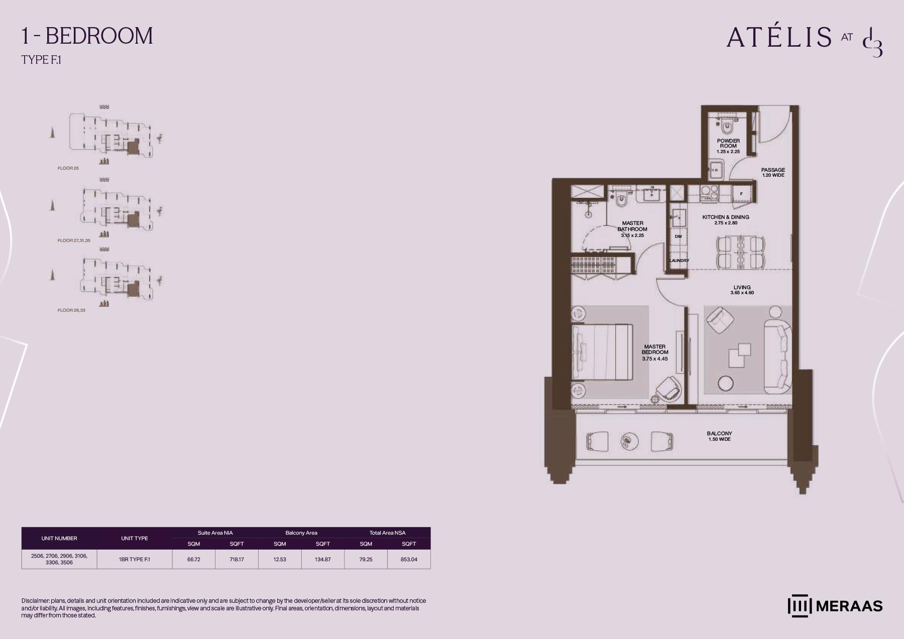 | Floor 25-35 | 1 Bedroom | Type F1 (Unit 2506-3506) | 853.04 Sq Ft | Apartments |