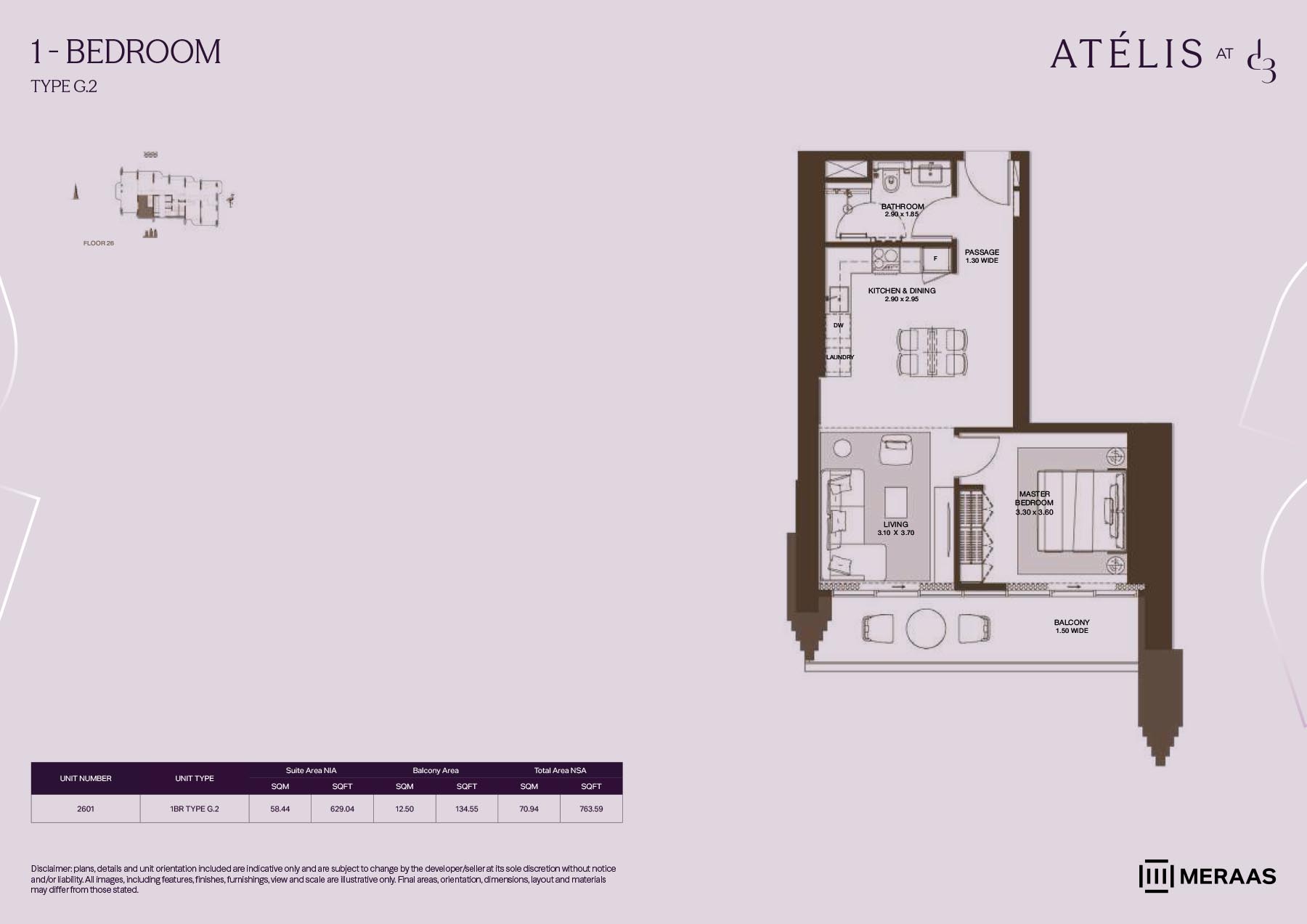 | Floor 26 | 1 Bedroom | Type G2 (Unit 2601) | 763.59 Sq Ft | Apartments |
