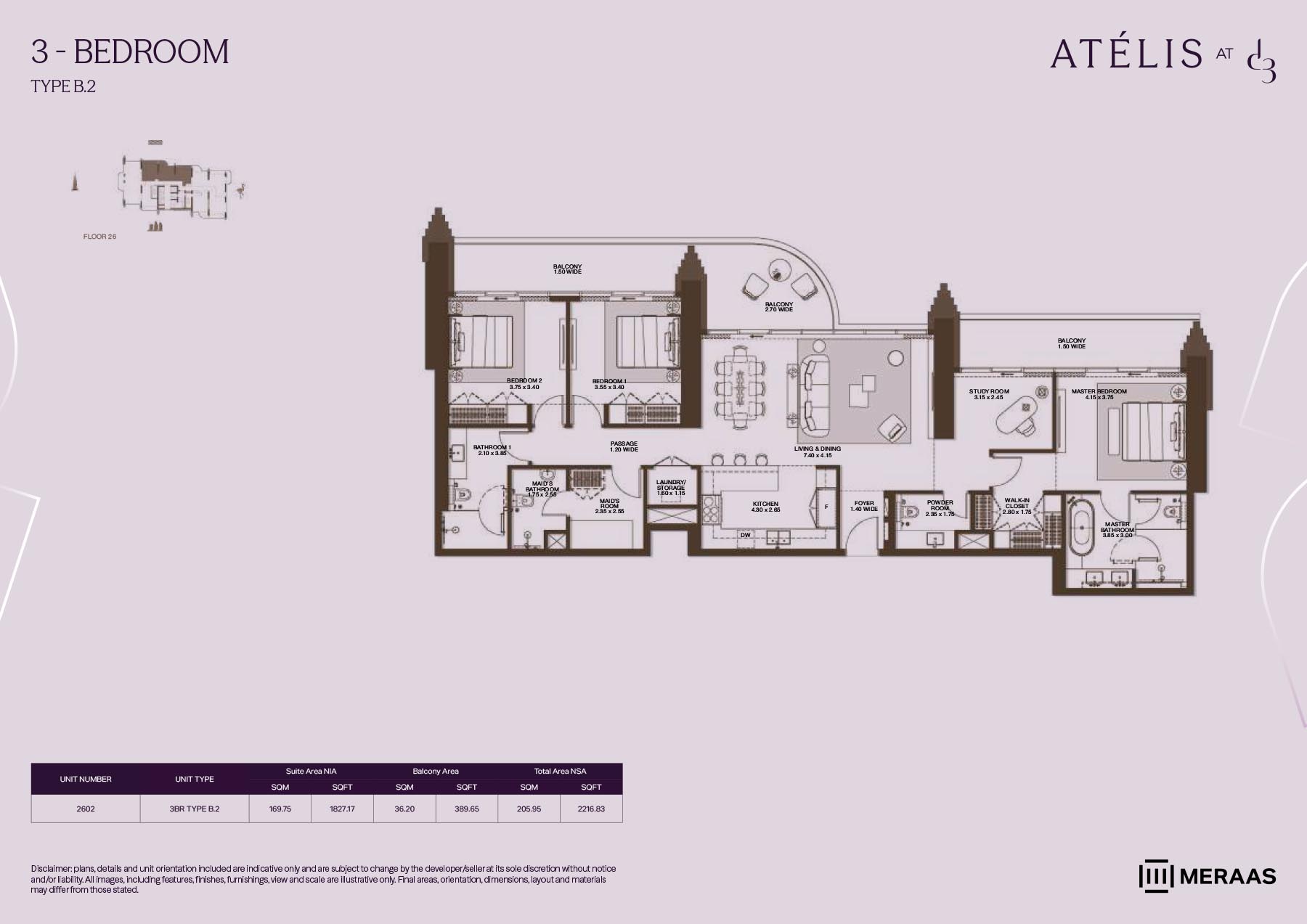 | Floor 26 | 3 Bedrooms + Study + Maid | Type B2 (Unit 2602) | 2216.83 Sq Ft | Apartments |