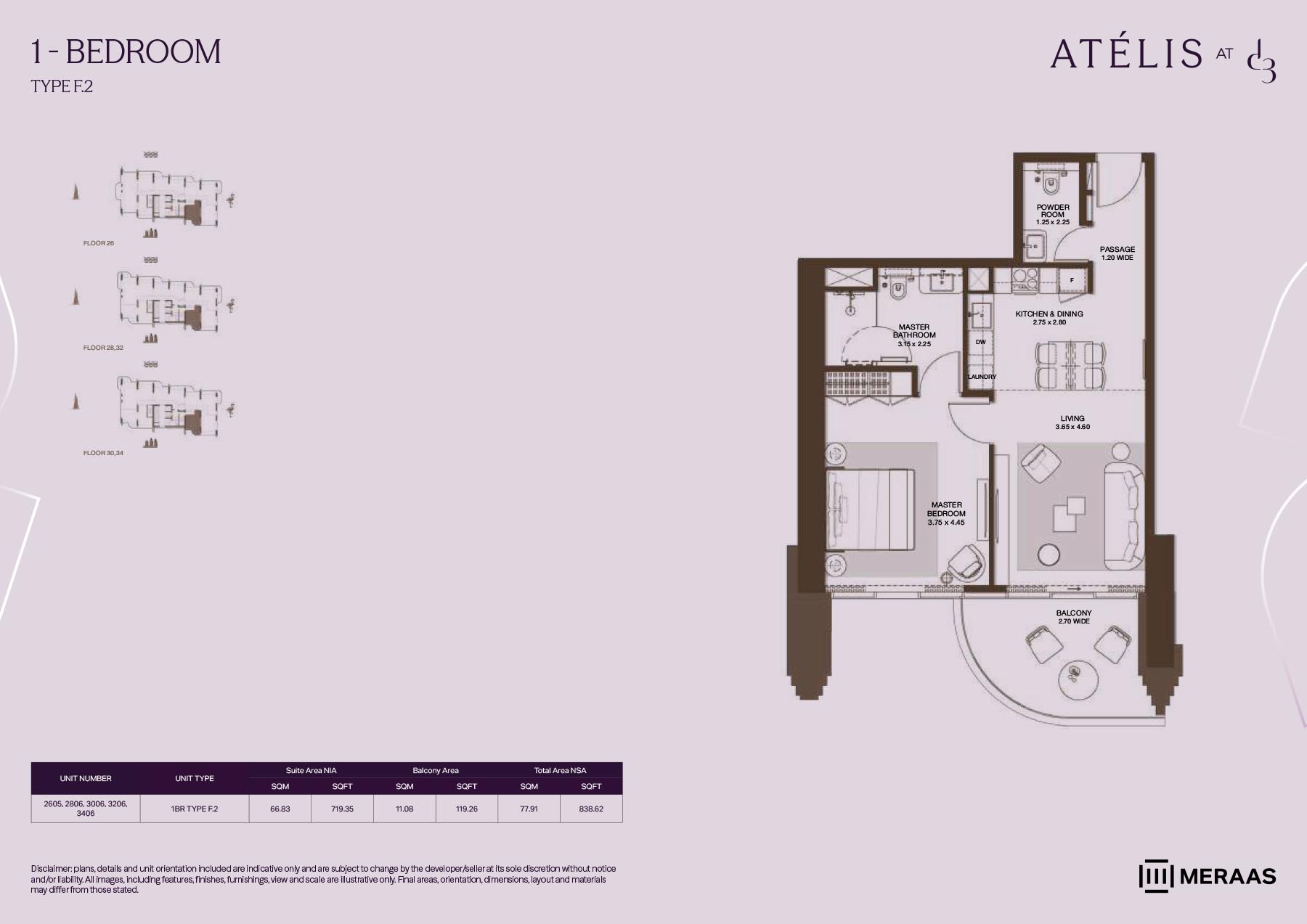 | Floor 26-34 | 1 Bedroom | Type F2 (Unit 2606-3406) | 838.62 Sq Ft | Apartments |