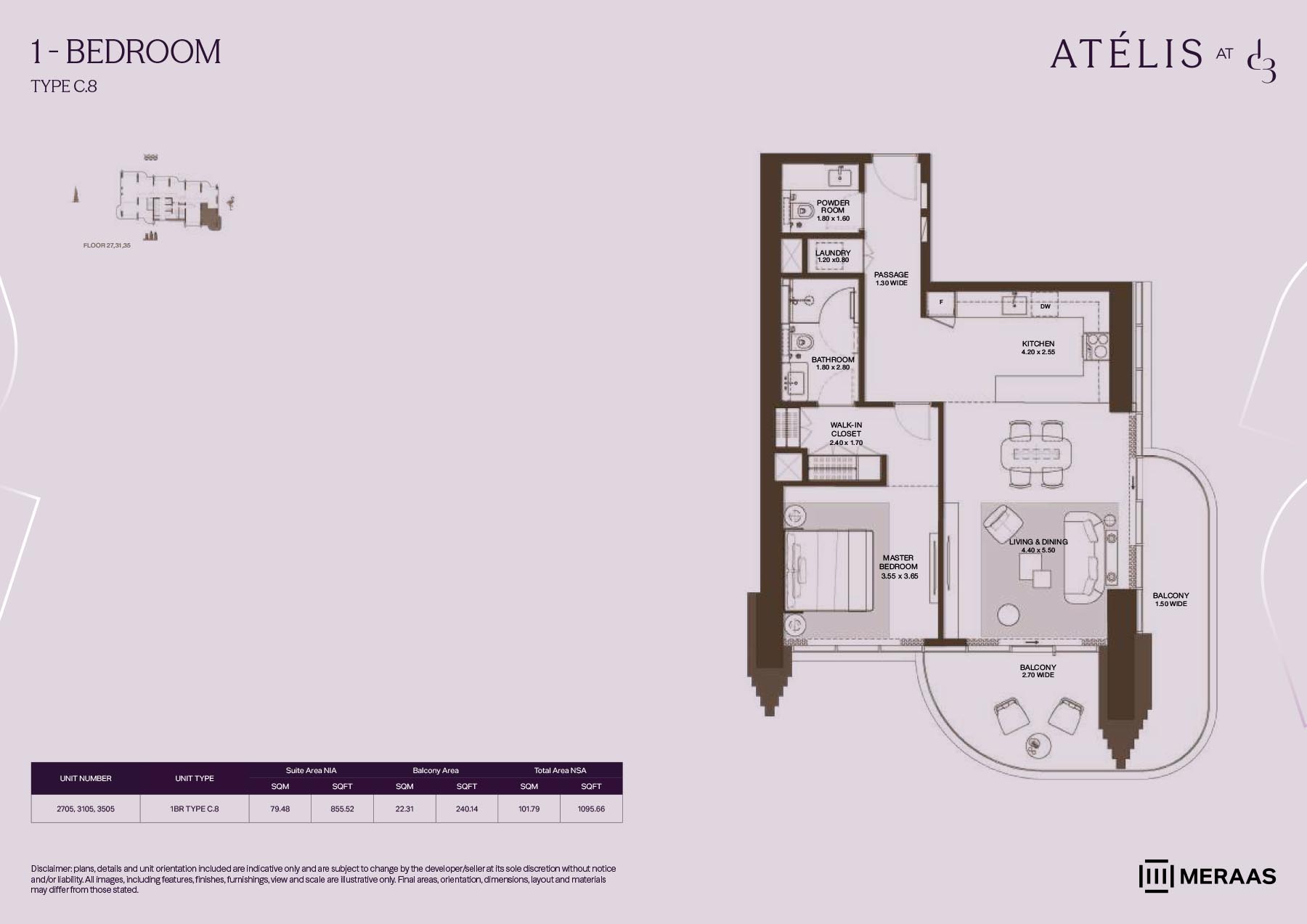 | Floor 27-35 | 1 Bedroom | Type C8 (Unit 2705-3505) | 1095.66 Sq Ft | Apartments |