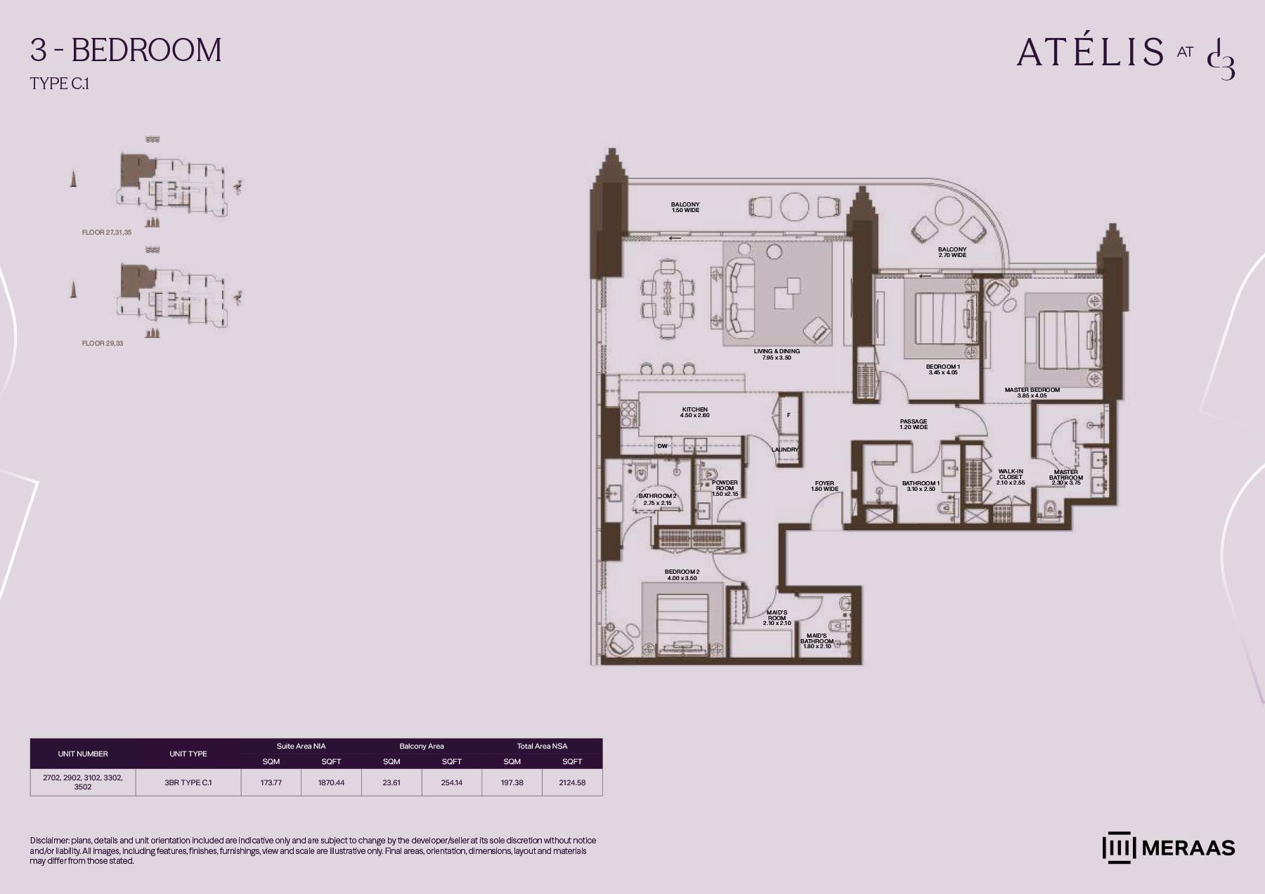 | Floor 27-35 | 3 Bedrooms + Maid | Type C1 (Unit 2702-3502) | 2124.58 Sq Ft | Apartments |