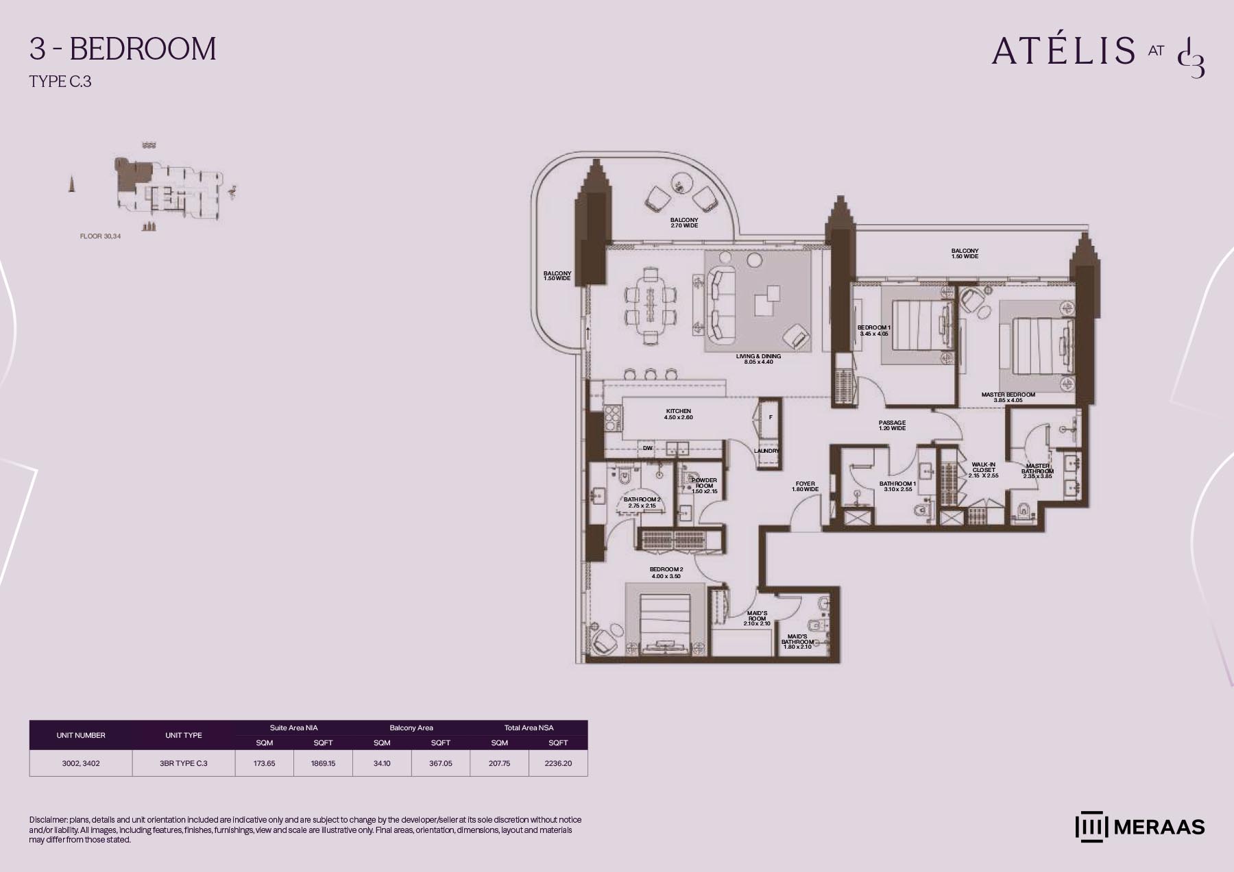 | Floor 30 & 34 | 3 Bedrooms + Maid | Type C3 (Unit 3002 & 3402) | 2236.20 Sq Ft | Apartments |