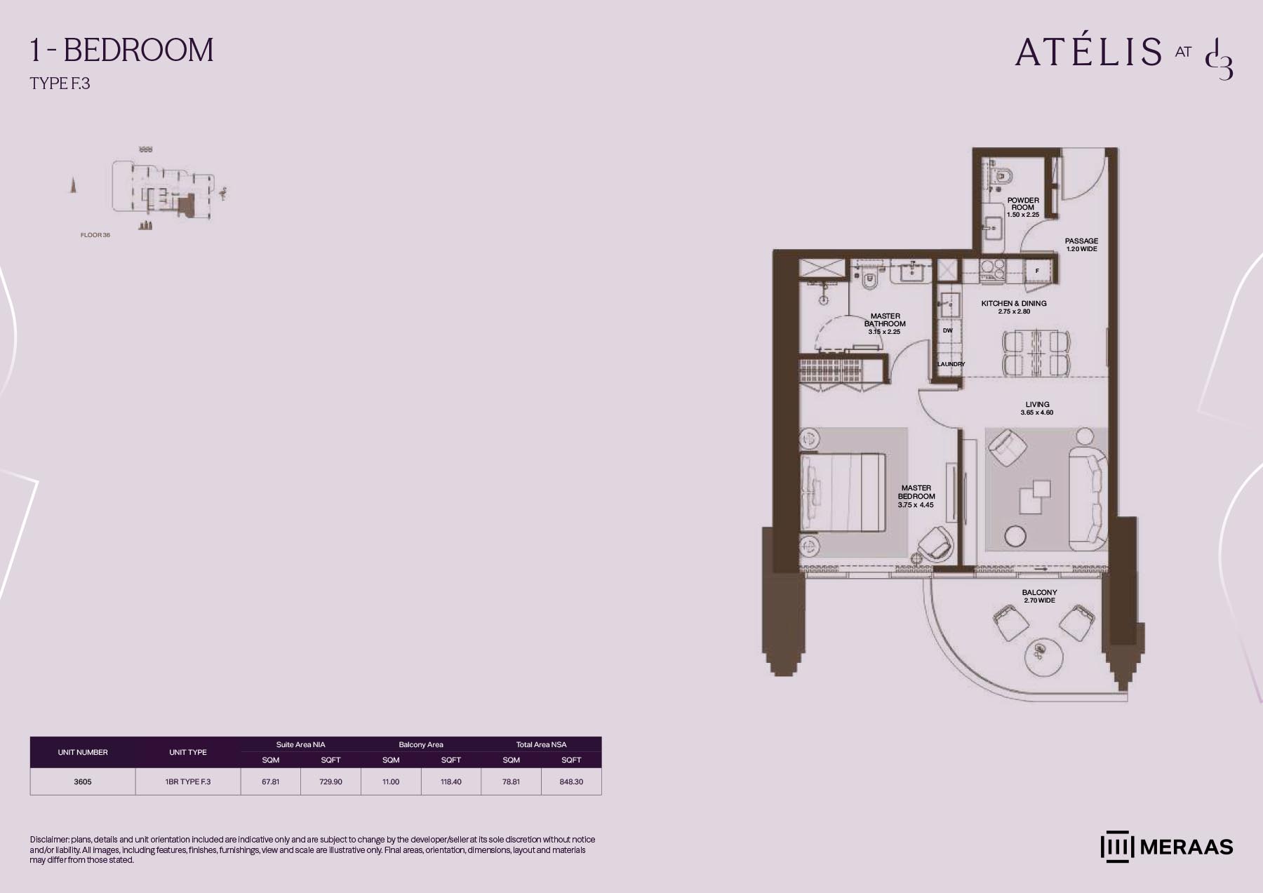 | Floor 36 | 1 Bedroom | Type F3 (Unit 3605) | 848.30 Sq Ft | Apartments |