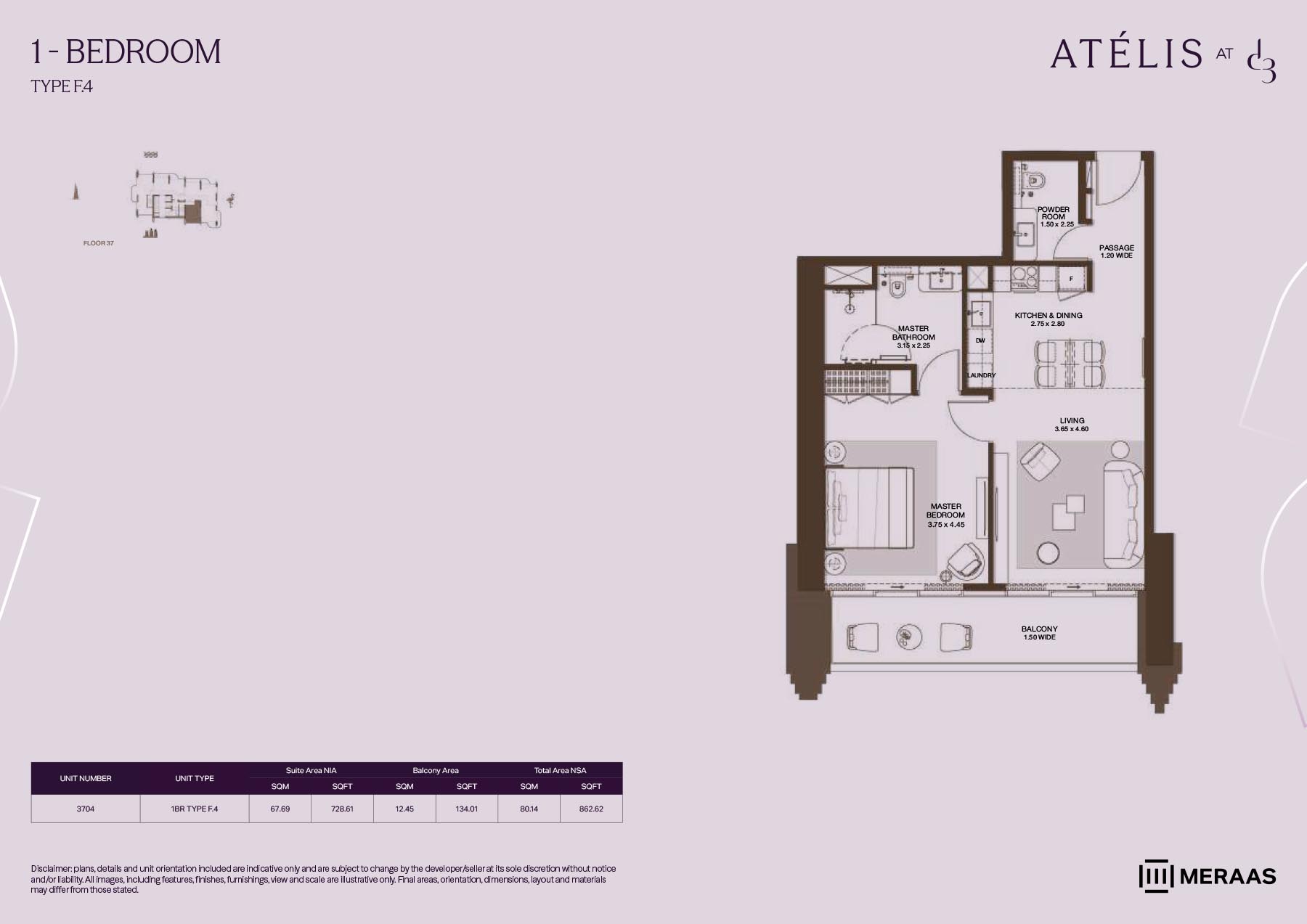 | Floor 37 | 1 Bedroom | Type F4 (Unit 3704) | 862.62 Sq Ft | Apartments |