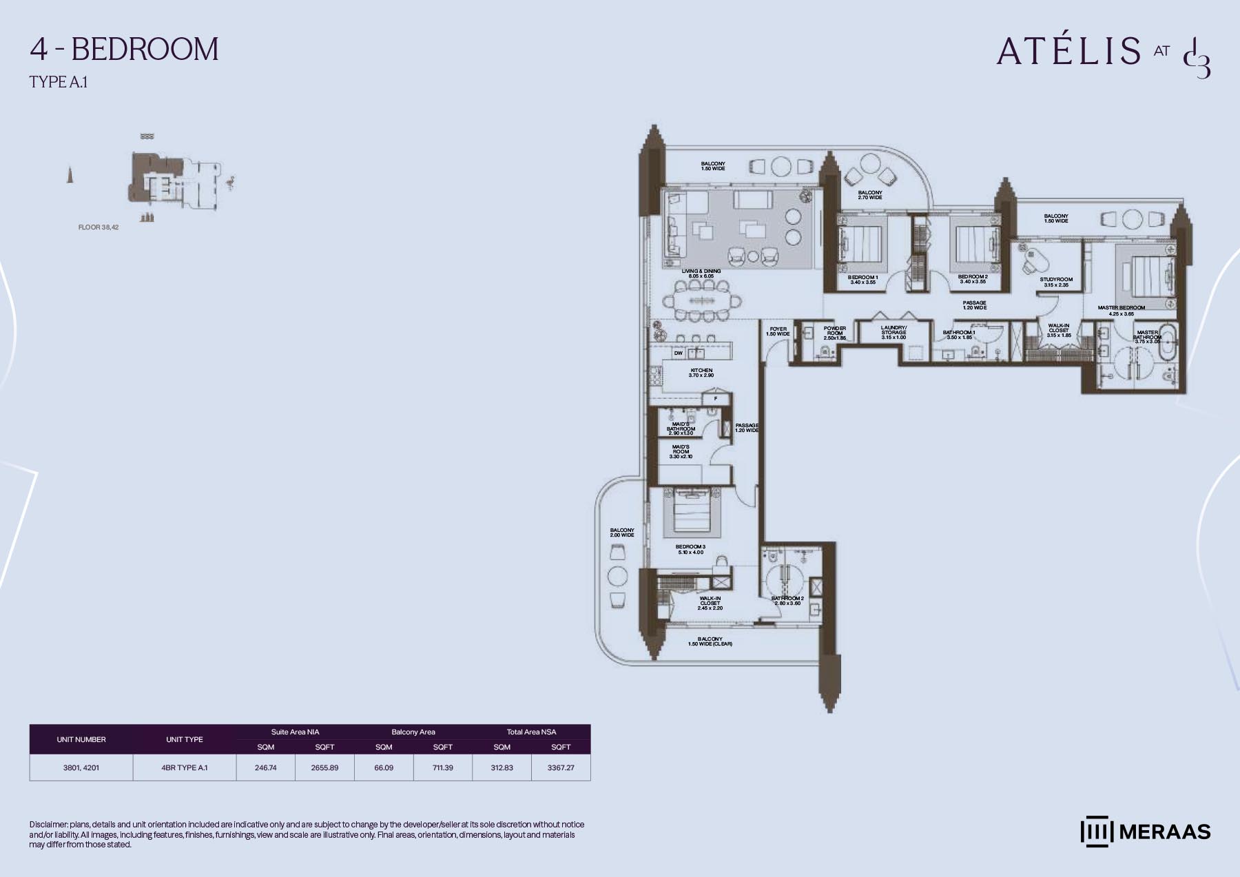 | Floor 38 & 42 | 4 Bedrooms + Study + Maid | Type A1 (Unit 3801 & 4201) | 3367.27 Sq Ft | Apartments |