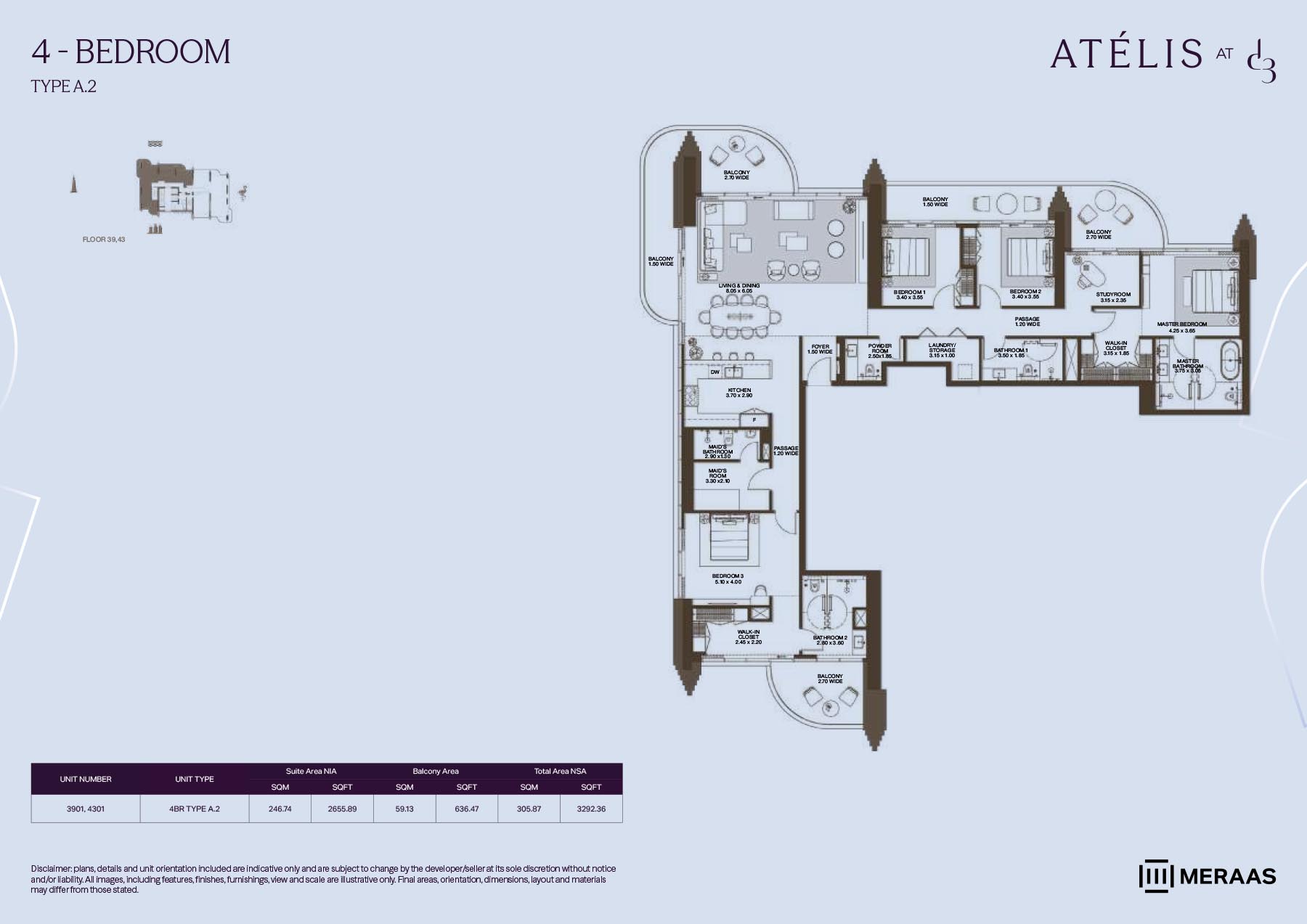 | Floor 39 & 43 | 4 Bedrooms + Study + Maid | Type A2 (Unit 3901 & 4301) | 3292.36 Sq Ft | Apartments |