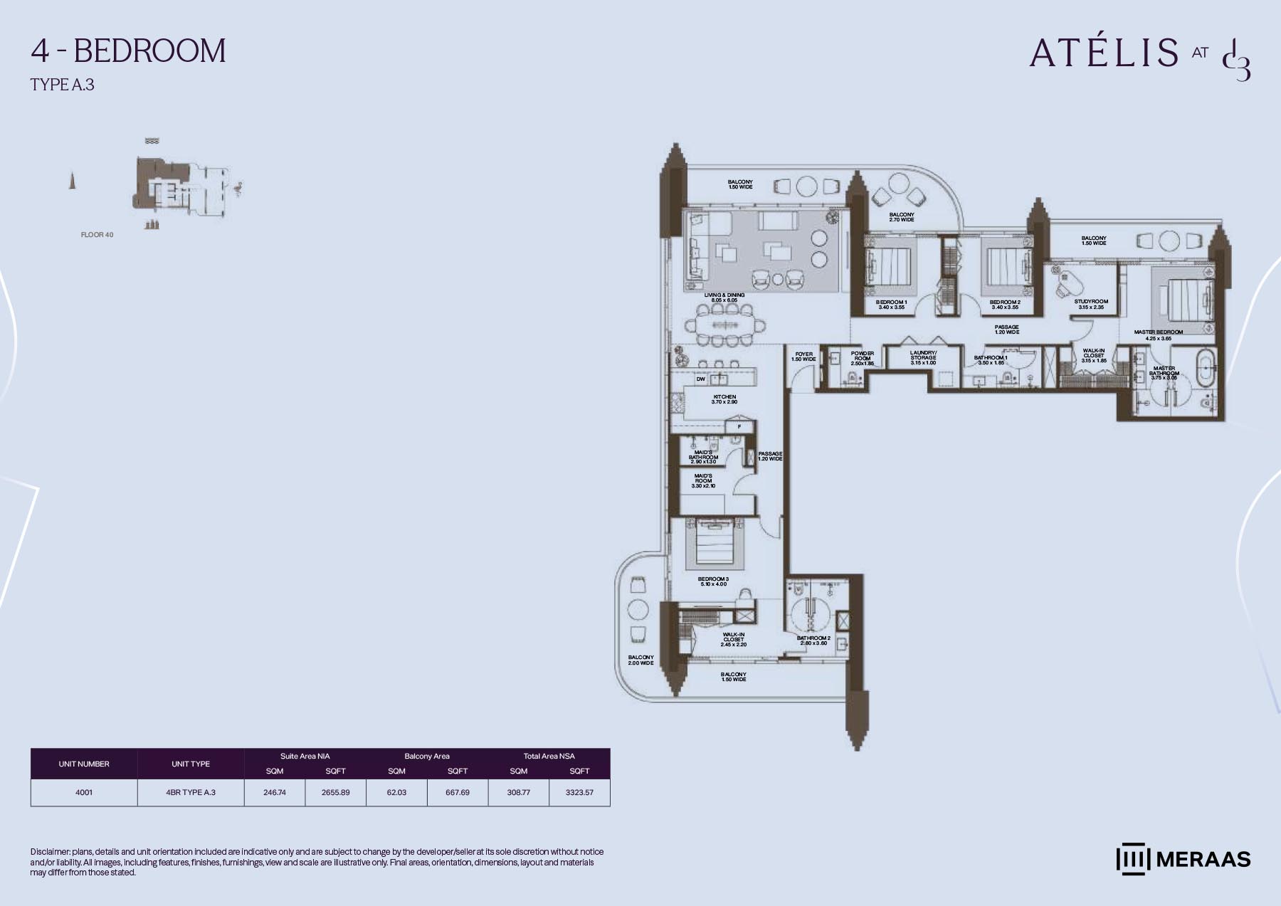 | Floor 40 | 4 Bedrooms + Study + Maid | Type A3 (Unit 4001) | 3323.57 Sq Ft | Apartments |