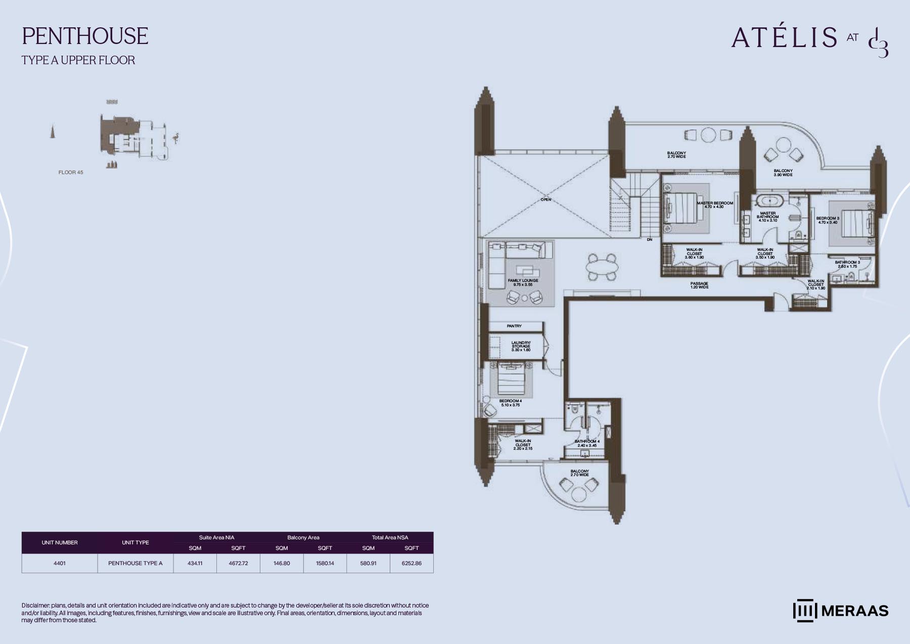 | Floor 44 & 45 | 5 Bedrooms + Maid | Type A Upper Floor (Unit-4401) | 6252.86 Sq Ft | PentHouses |