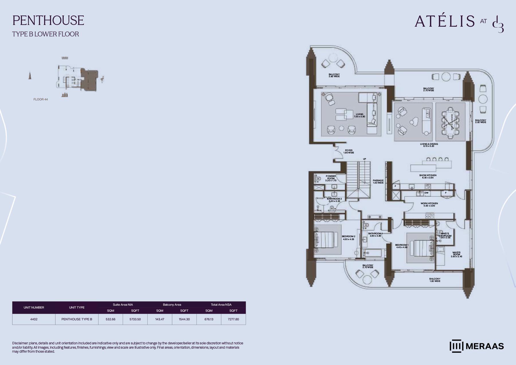 | Floor 44 & 45 | 5 Bedrooms + Maid | Type B Lower Floor (Unit-4402) | 7277.80 Sq Ft | PentHouses |
