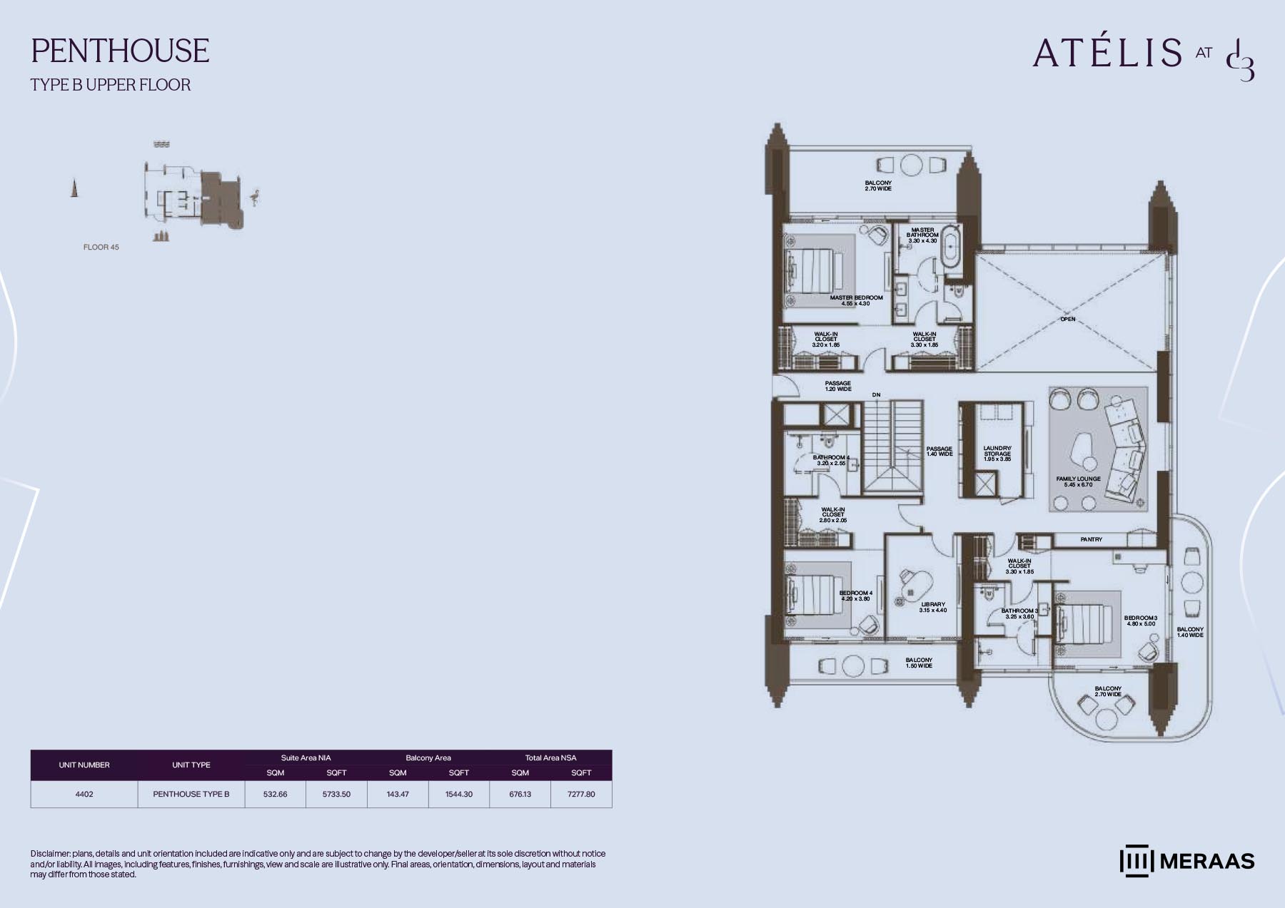 | Floor 44 & 45 | 5 Bedrooms + Maid | Type B Upper Floor (Unit-4402) | 7277.80 Sq Ft | PentHouses |