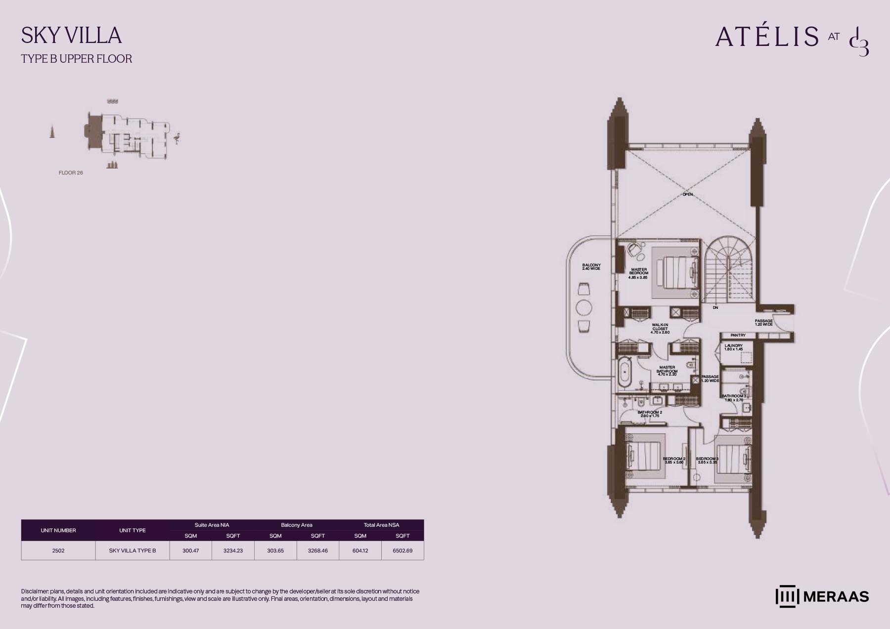 | Floor 25 & 26 | 4 Bedrooms + Maid | Type B Upper Floor (Unit-2502) | 6502.69 Sq Ft | Sky Villa |