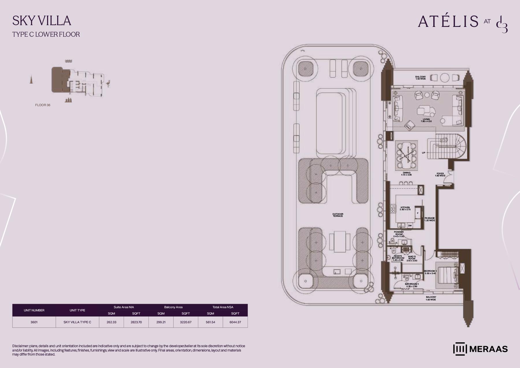 | Floor 36 & 37 | 4 Bedrooms + Maid | Type C Lower Floor (Unit-3601) | 6044.37 Sq Ft | Sky Villa |