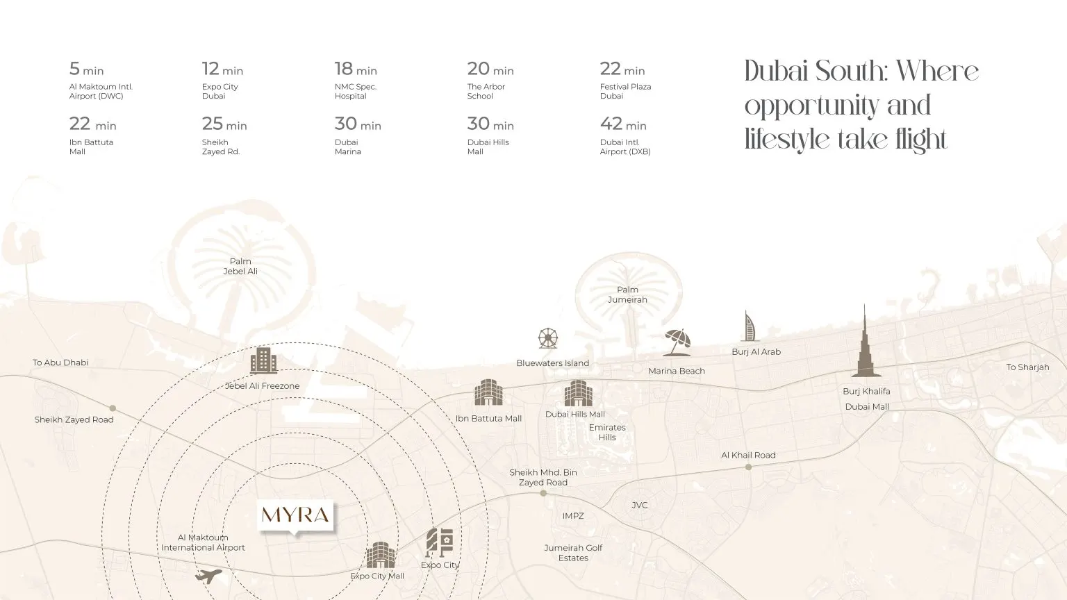 The master plan of Myra Residences is created by Sikanta Real Estate Development at exclusive location of Dubai South. The property is offered in different sizes such as studio, one, two, and three-bedroom apartment to meet the preference of professionals as well families both. The property is having contemporary design and loaded with all the modern amenities to ensure that residents can enjoy residing in this development. The units of this development feature advanced appliances, smart system that enhances security, energy efficiency and provide a comfortable living standard. The property offers quick access to key landmarks of Dubai such as Dubai Marina, Dubai Miracle Garden, Palm Jumeirah and Downtown Dubai.