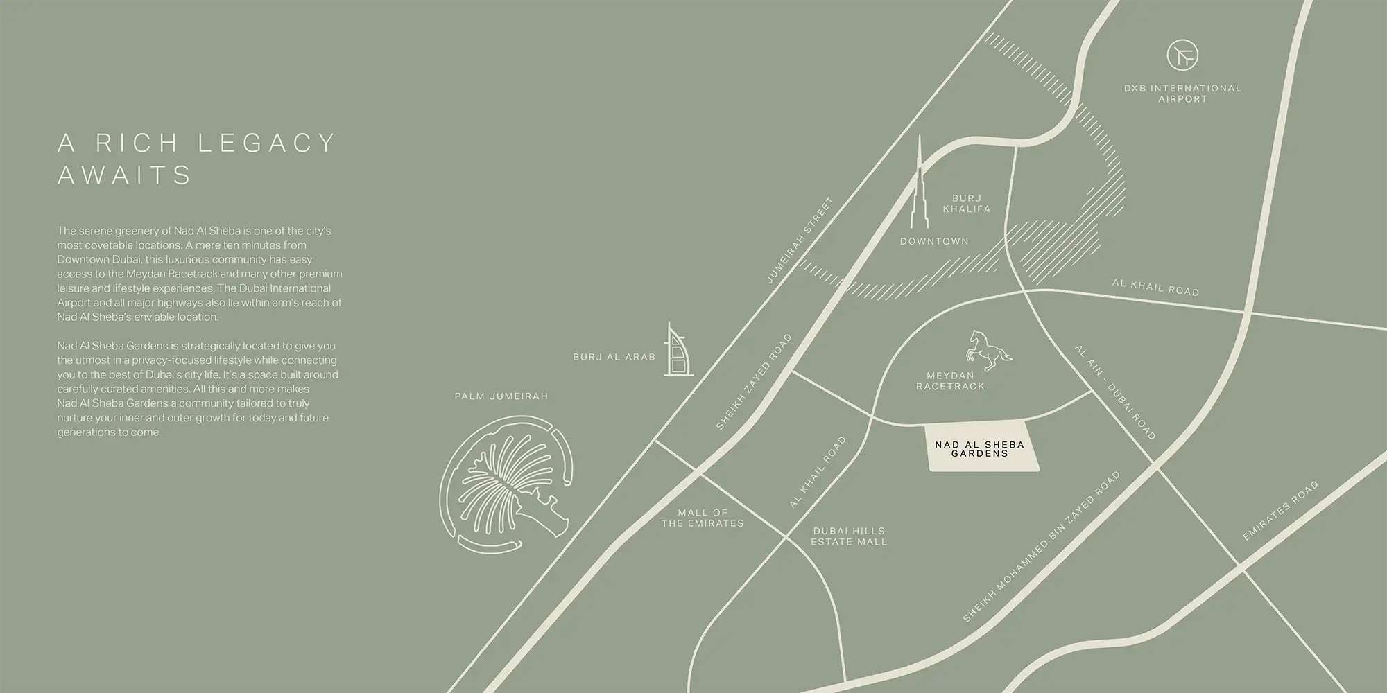 Nad al Sheba Gardens Phase 11 is ideally situated in Nad Al Sheba Dubai, the perfect setting for a lifestyle. That embraces natural elements Calmness and relaxation and an environment of peace city living. Situated near Downtown Dubai, connectivity is through a network of highways including Sheikh Zayed Road, Al Khail Road and Emirate Boulveard, with the Quiet Oasis easily accessible from all commercial districts in the city. Despite the convenience of living in an Inner-City location, both peace and privacy. This niche location allows you the best of both worlds as it is by a nature-filled environment, but with immediate access to Dubai’s lively lifestyle, entertainment destinations, and leisure venues.