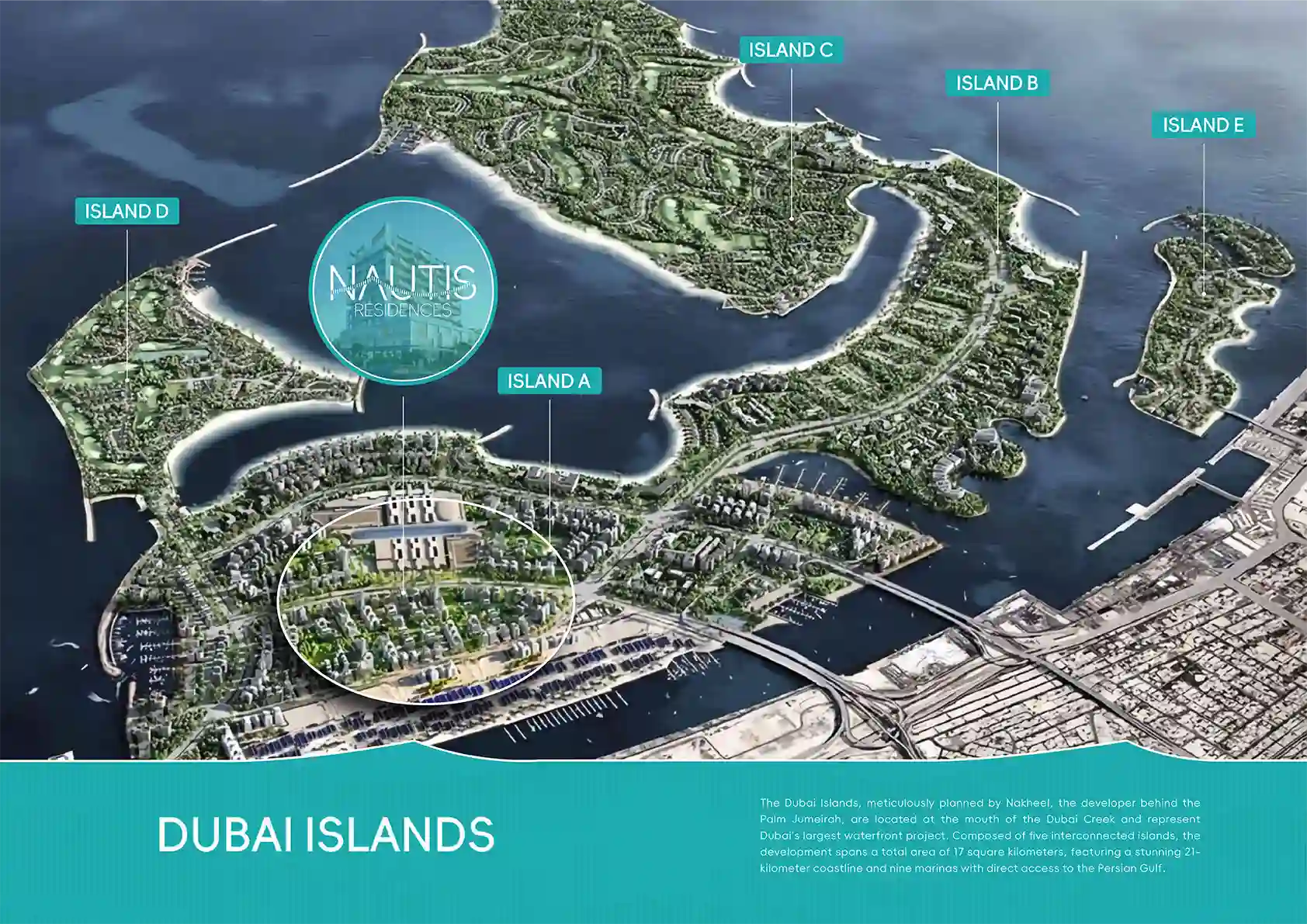 Crafted with vision and accuracy, Nautis Residences by Stamn Development focus mainly on modern island living through inspired master planning. This is a low-rise architectural design which offers a balance and harmonious connection with the surrounding environment. It incorporates the open spaces ideal for walking, landscaped gardens, and scenic fishing paths that lead to a serene waterfront. There are uplifted upper-level residences offer exclusive privacy and pristine views, while luxurious podium-level amenities cultivate a vibrant, balanced community lifestyle. The project integrates a resort-inspired design with dedicated recreational amenities, private beachfront access, and a functioning marina. This development adheres to sustainable urban planning principles that incorporates energy-efficient technologies and green landscape elements in alignment with Dubai’s environmental policies.