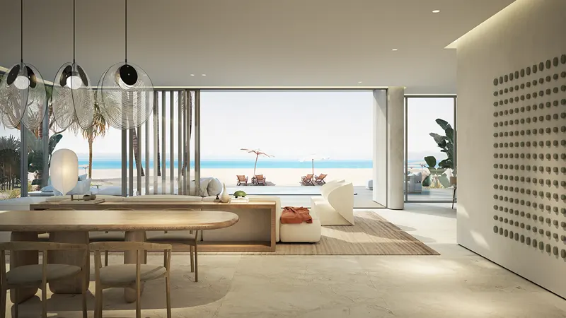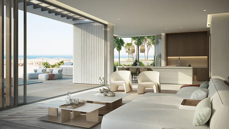 One of the standout features of these villas is the private rooftop plunge pool, providing a perfect spot for relaxation. The modern architecture, sleek lines, and large glass facades bring a lot of natural light into the houses and offer beautiful views of the Arabian Gulf. Designed for seamless indoor-outdoor living, the open-plan living and dining spaces flow effortlessly into the outdoor areas. Living and dining areas reflect Mediterranean elegance with Italian porcelain tiles, textured-finished walls, and ambient lighting. The kitchens are equipped with top-of-the-line appliances and finished with exquisite materials, ensuring they are as functional as they are stylish. Timber staircases with glass balustrade and infinity garden pools add more dramatic touches to these units.