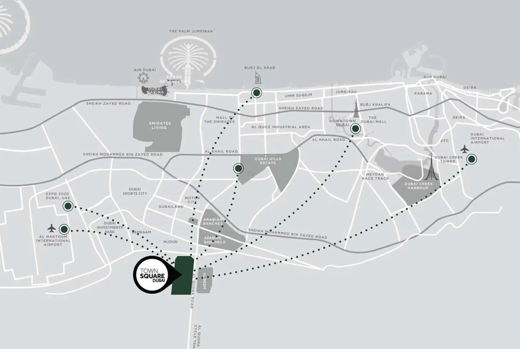 Nestled in a prime location, Town Square Dubai, Alton helps a smooth and better connectivity to all the important areas of the city. Experience elevated living in this premium gated enclave where lifestyle meets convenience. Designed for a balanced way of life, the community blends education, leisure, fitness, and social engagement all just steps from your door. Located at Al Qudra and Emirates Road, this prime address offers direct highway access to Dubai’s iconic landmarks, famous districts, and world-wide famous attractions. Enjoy hassle free movement to world-class destinations Al Maktoum International Airport, Global Village, stunning waterfronts such as Dubai Marina and The Palm.