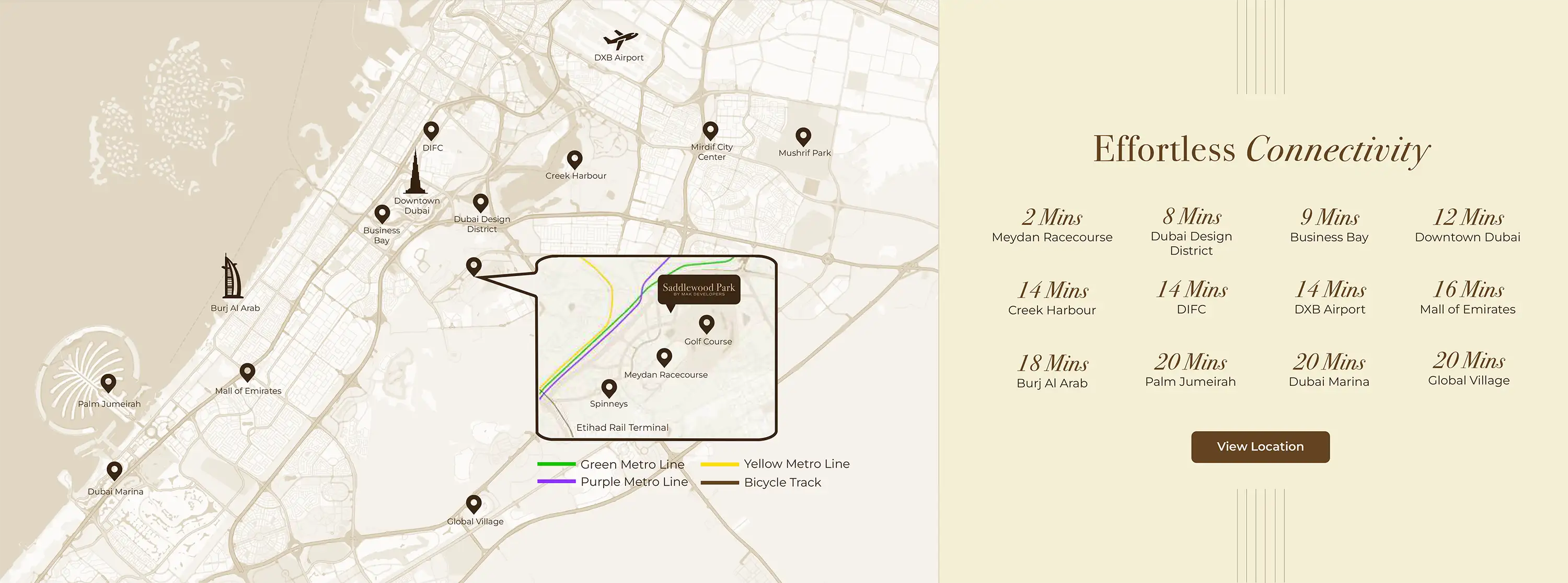 Saddlewood Park a residence in the hub of Meydan Avenue located in Nad Al Sheba 1 of Dubai that is smoothly connected to all the key areas of the city. It has smooth connection with all the major roadways and highways which is very close to Al Meydan Road that connects this region to the Al Ain and Al Khail Road. This connectivity provides an effortless movement to the Design District, Ras Al Khor Wildlife Sanctuary, Business Bay, Burj Khalifa, and Jumeirah Bay. All the basic facilities and luxury like Meydan Horse Racecourse, Meydan Academy Golf Course, many chic cafes, restaurants are available nearby.