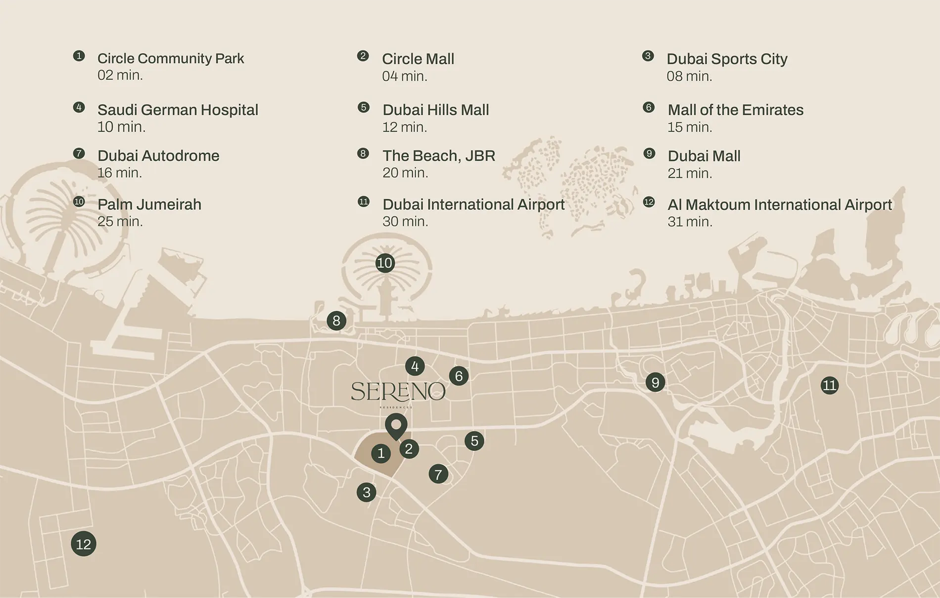 Sereno Residences in Jumeirah Village Circle (JVC), Dubai is flawlessly situated on Street 30, contribution residents a lifestyle enclosed by important luxuries and energetic charms. From parks, mosques, schools, and healthcare facilities to Circle Mall, dining spots, retail outlets, and sports hubs everything is just around the corner. With unified admittance to Al Khail Road and Sheikh Mohammed Bin Zayed Road, the address attaches smoothly to iconic Dubai landmarks such as The Palm, JBR Beach, Burj Al Arab, Dubai Hills Estate, Meydan, Downtown, and Business Bay.