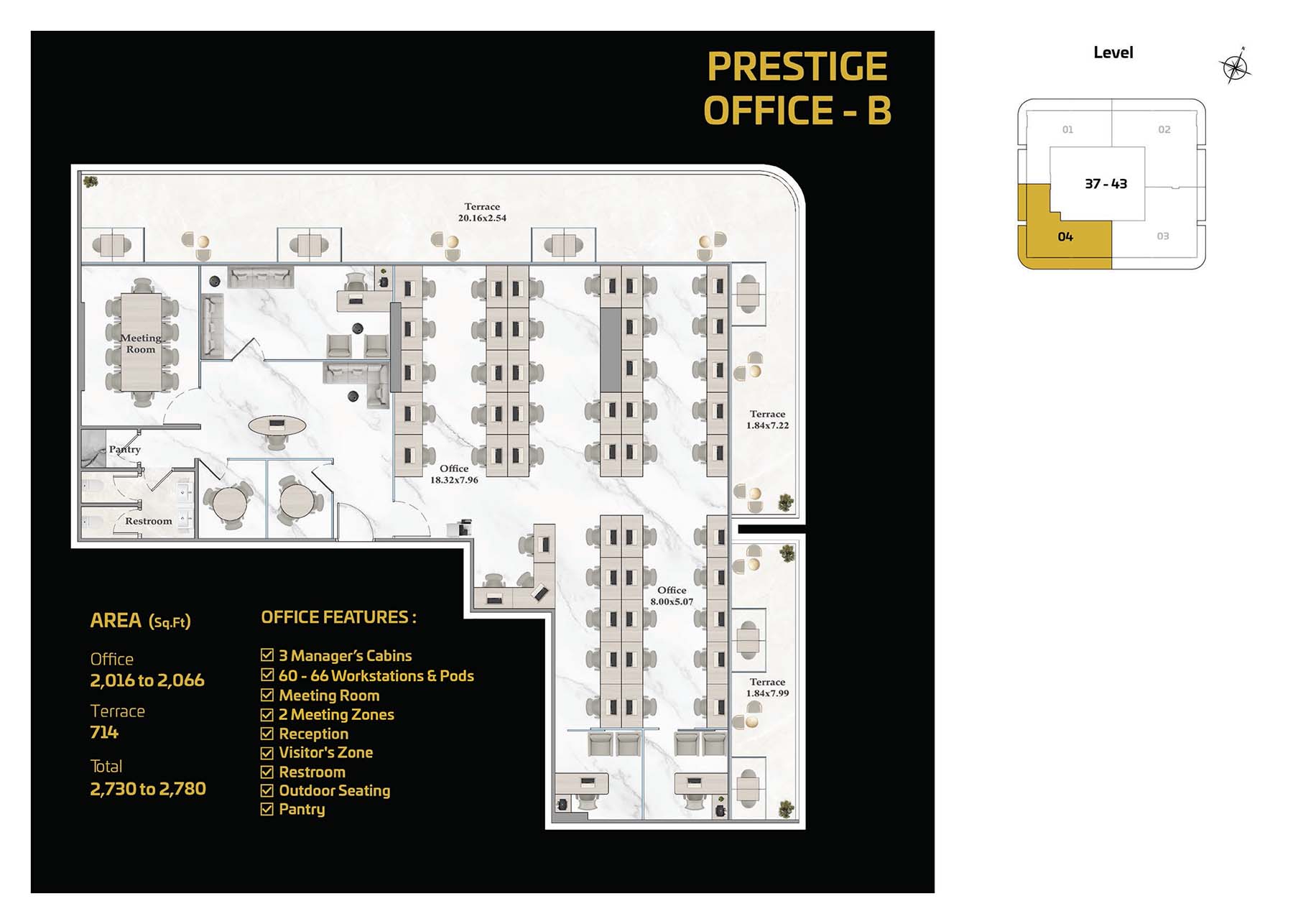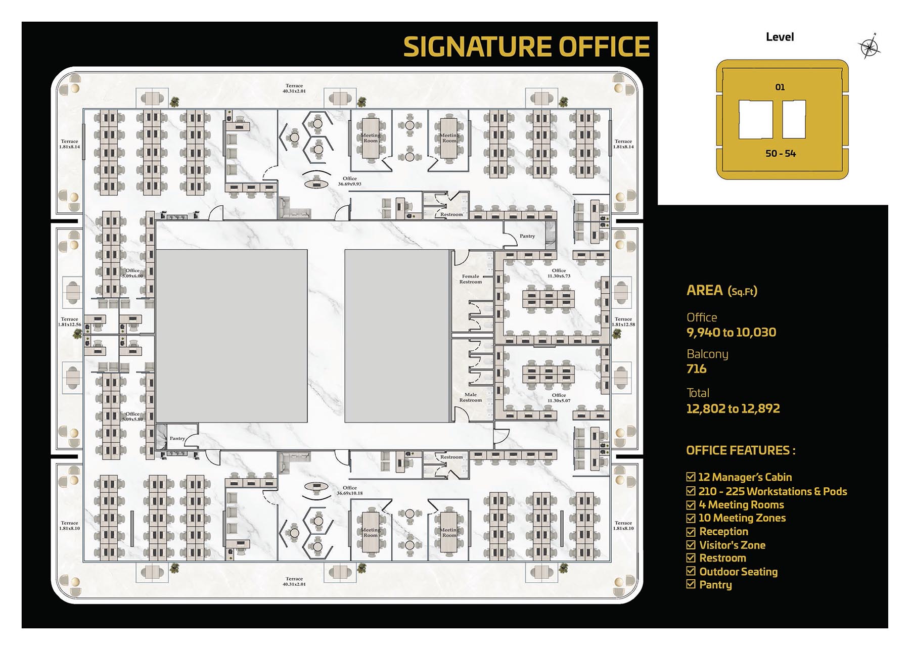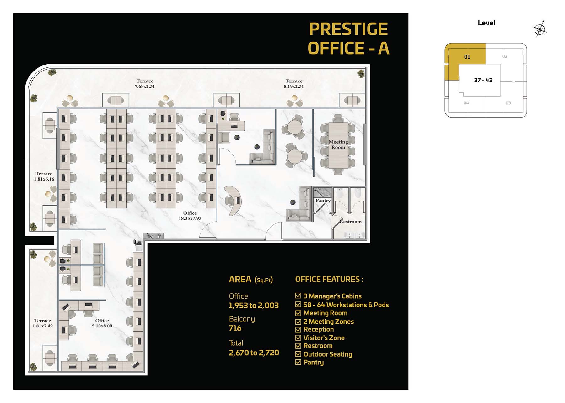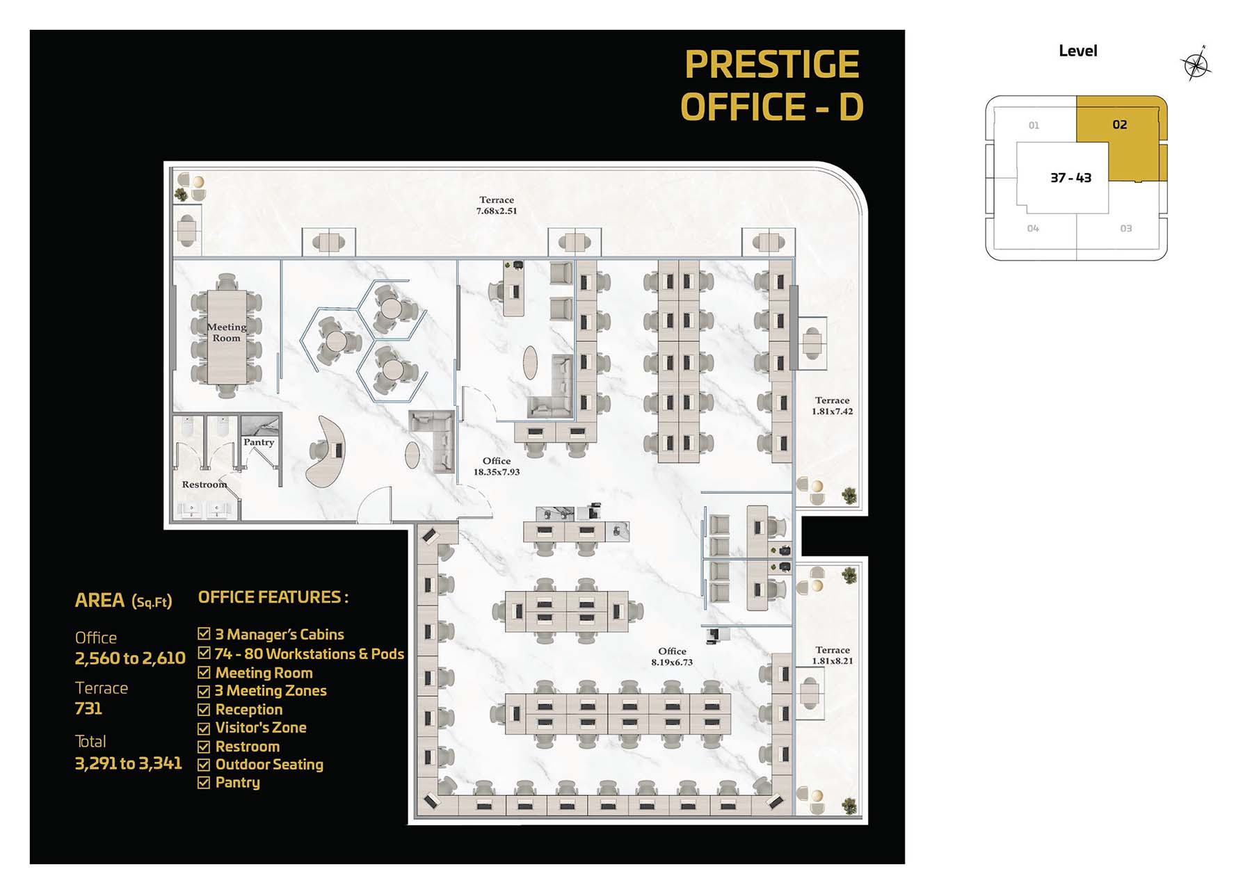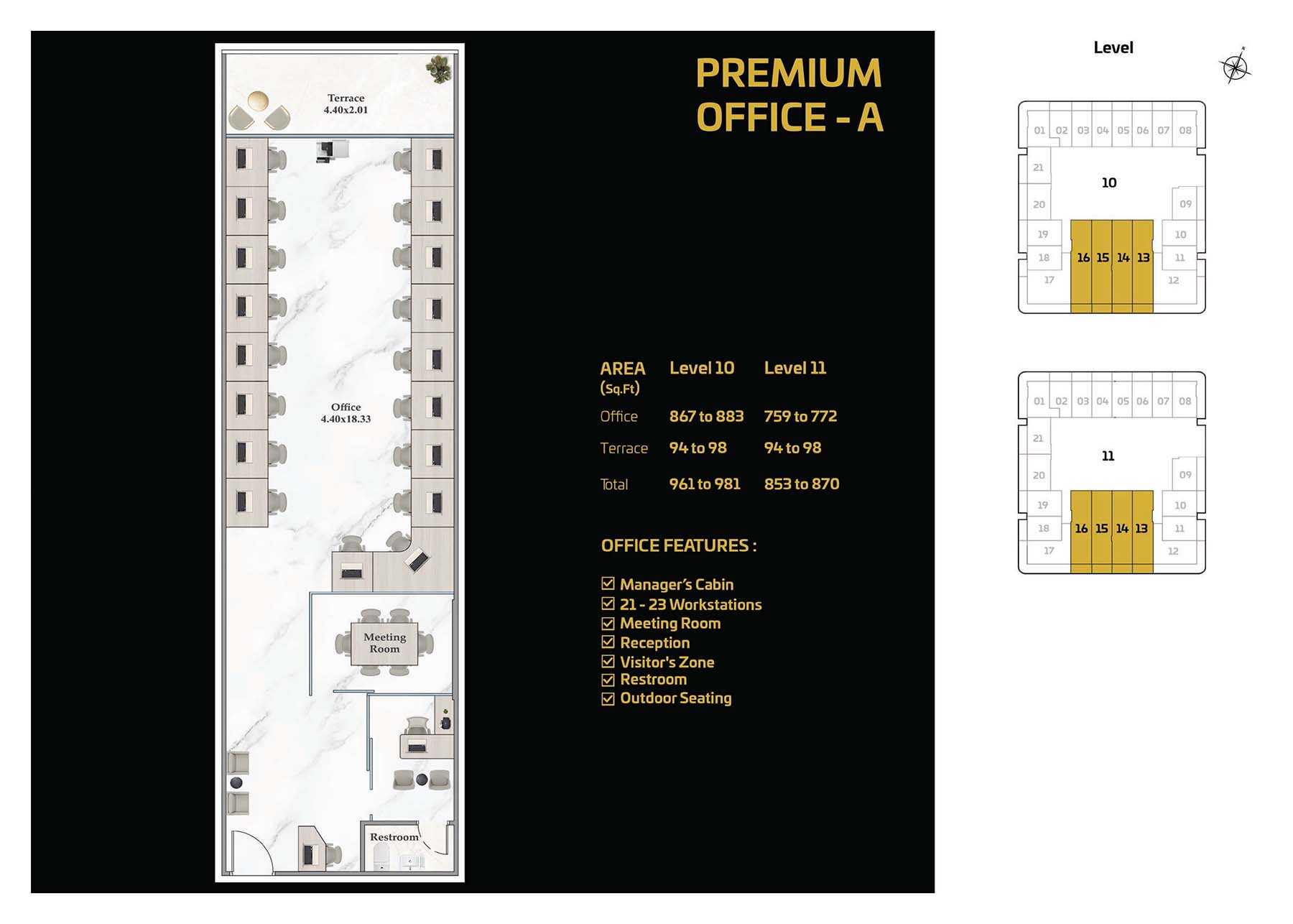 The Premium and Prestige offices are the two premium options supporting workstations which will better suit larger businesses. Floor plats are flexible and can be customized so a business’ floor plans will suite their operations all while keeping that professional & sleek presence.
