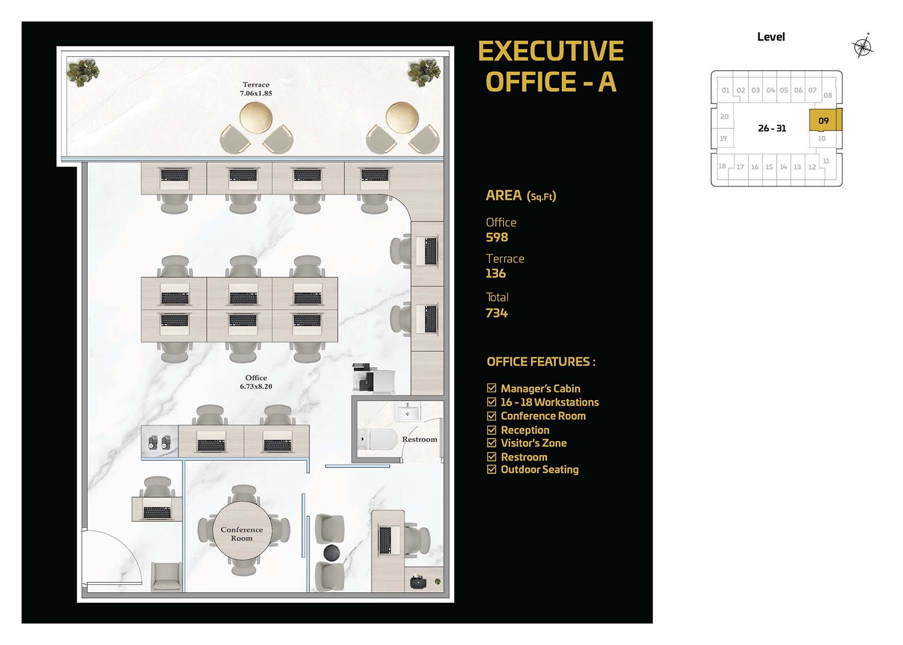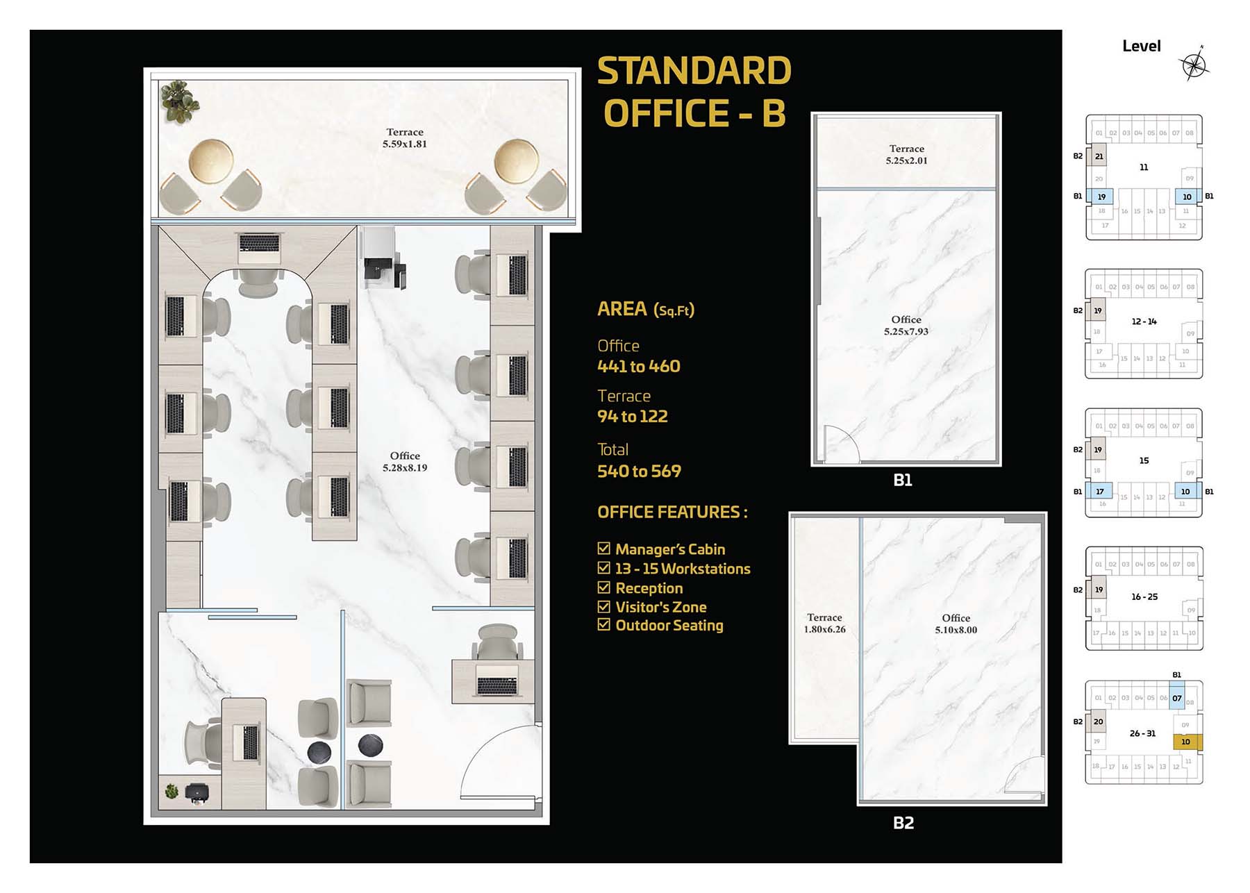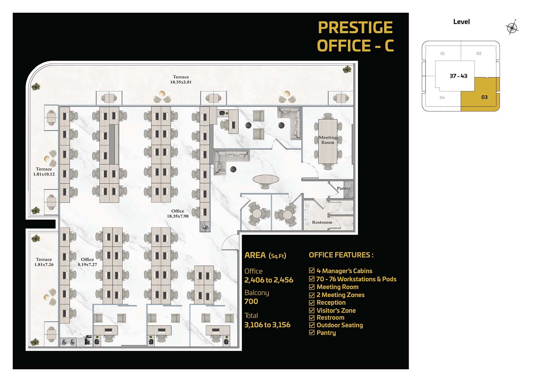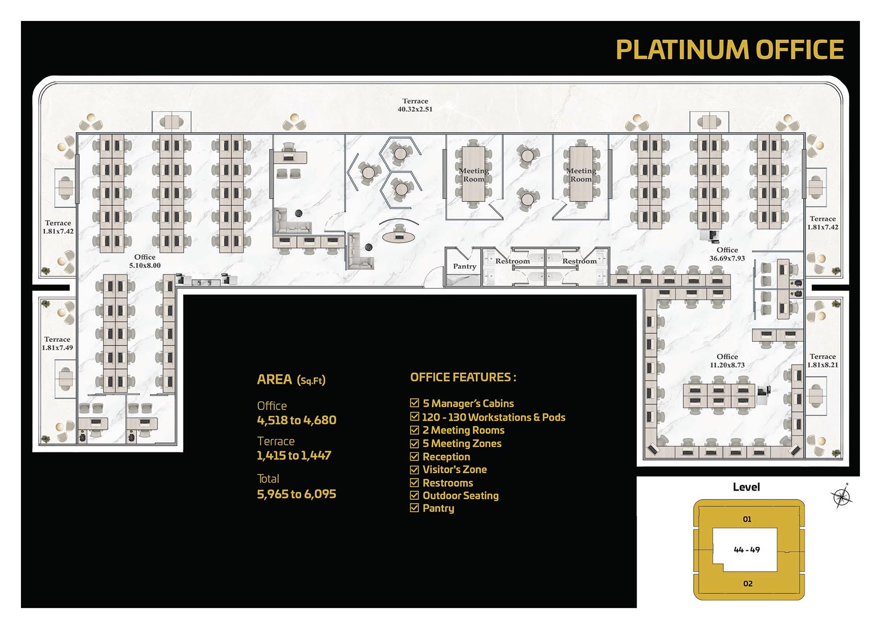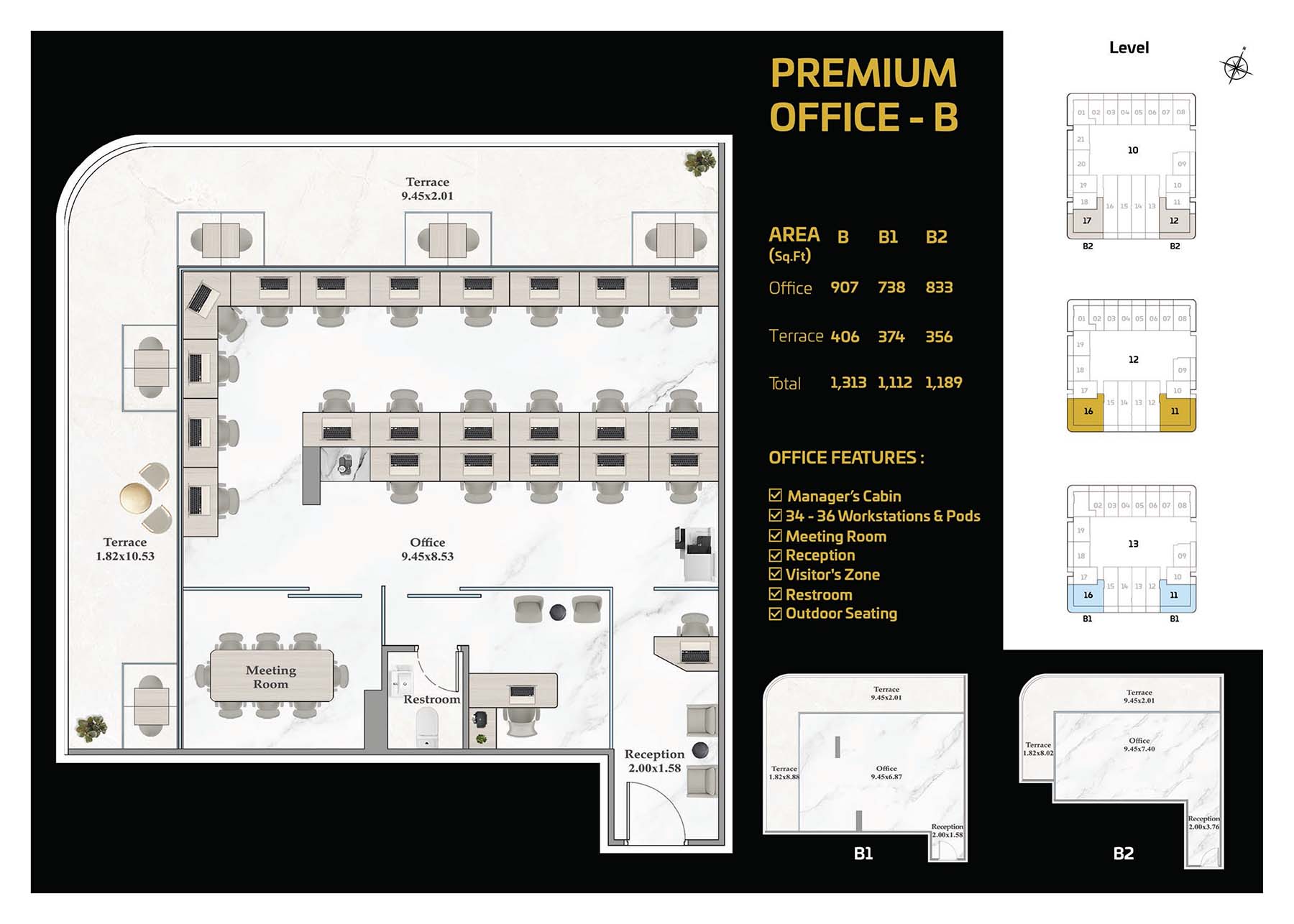 The Premium and Prestige offices are the two premium options supporting workstations which will better suit larger businesses. Floor plats are flexible and can be customized so a business’ floor plans will suite their operations all while keeping that professional & sleek presence.