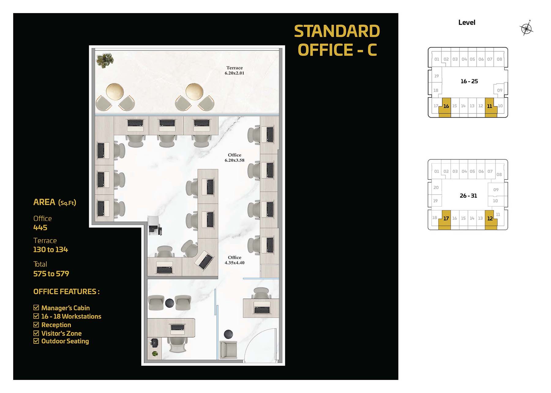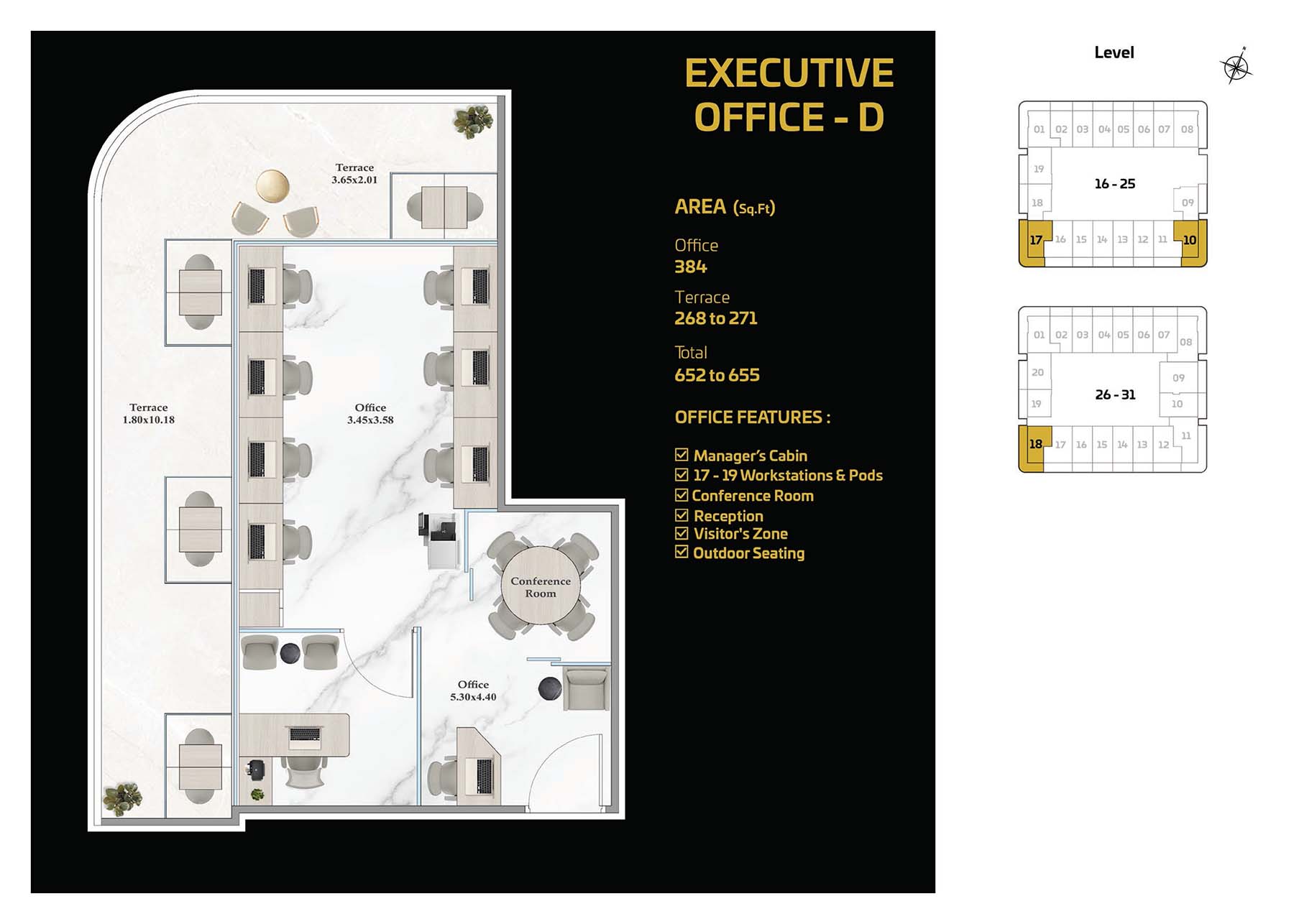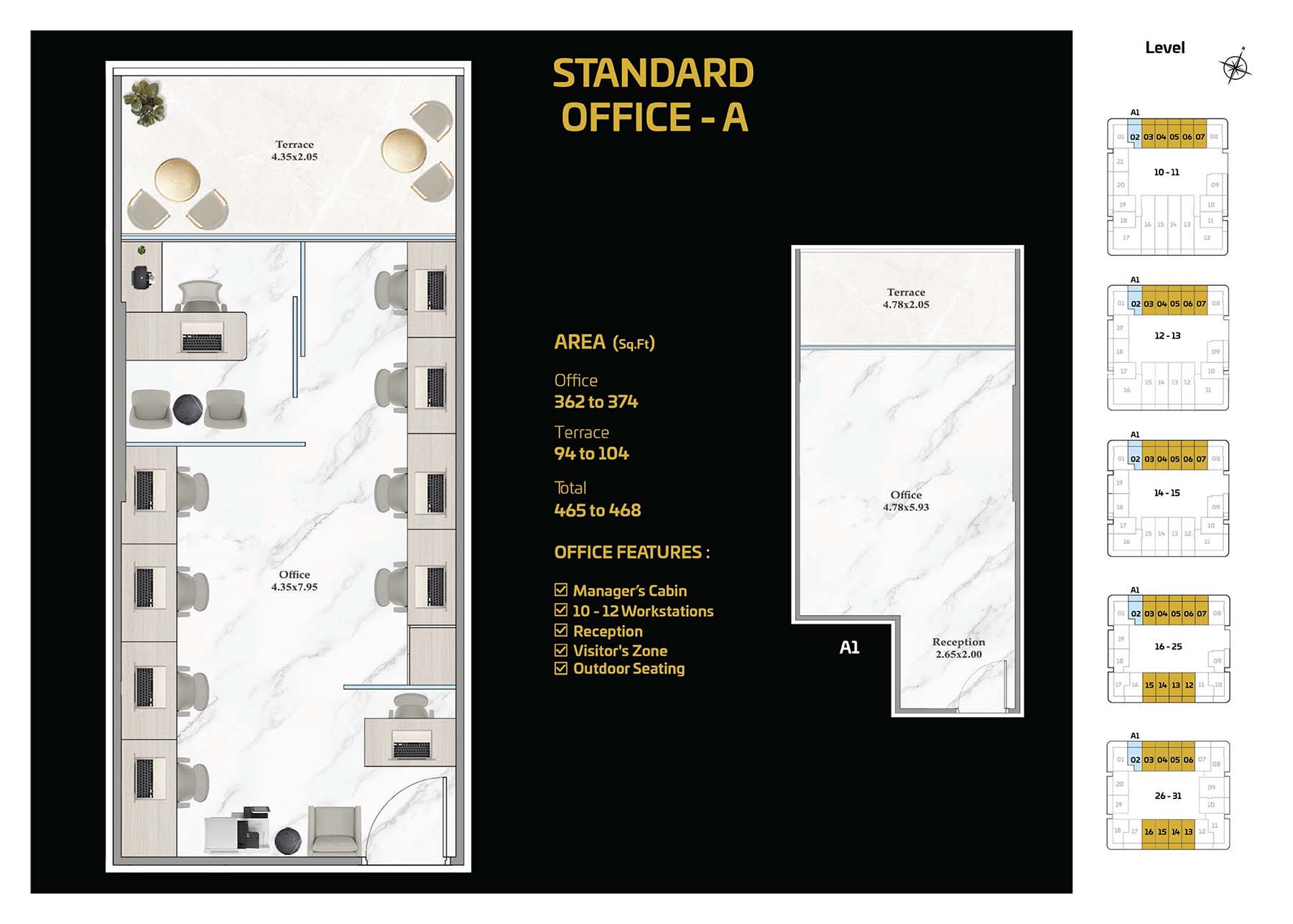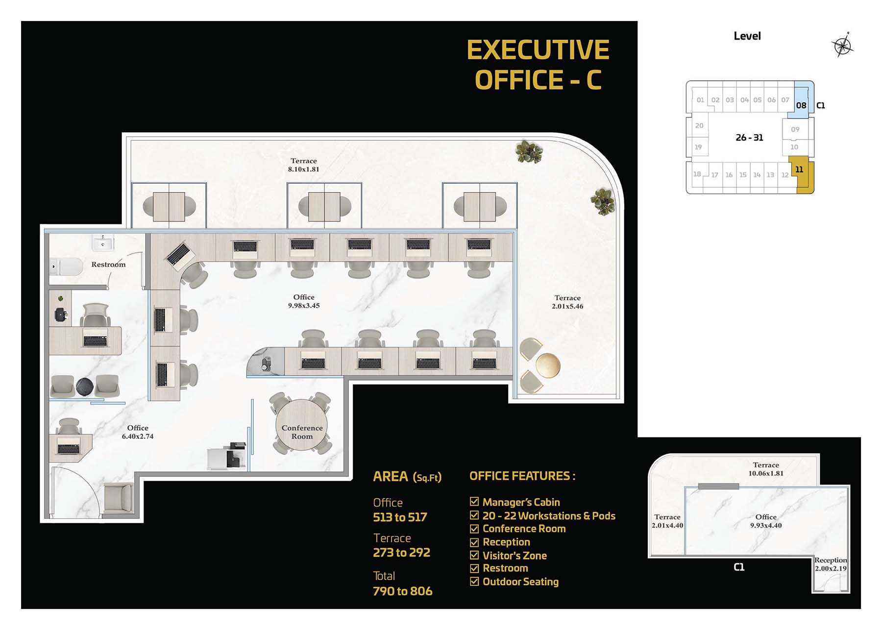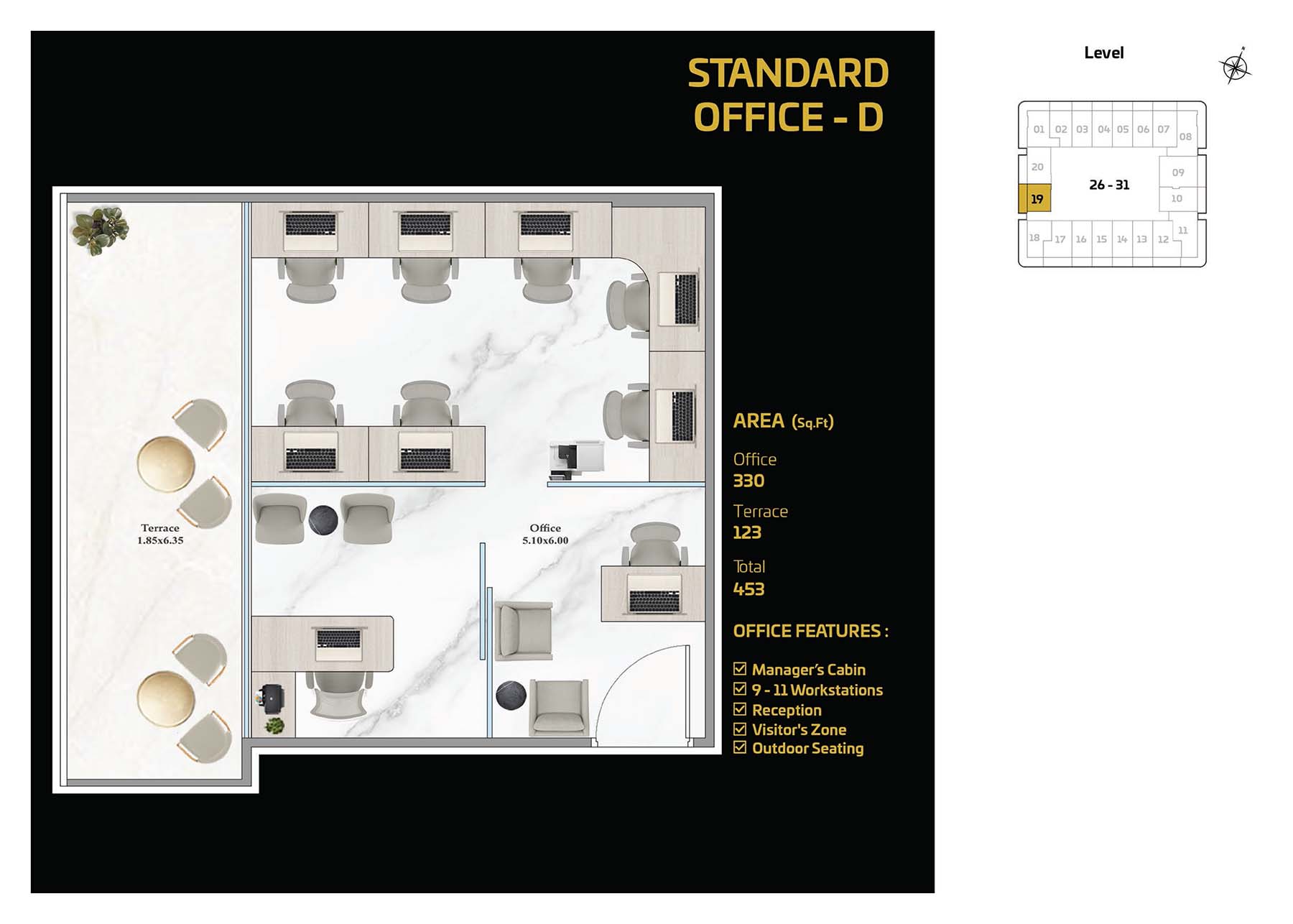 The Premium and Prestige offices are the two premium options supporting workstations which will better suit larger businesses. Floor plats are flexible and can be customized so a business’ floor plans will suite their operations all while keeping that professional & sleek presence.