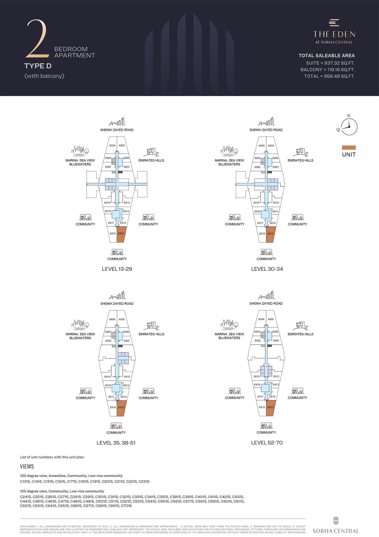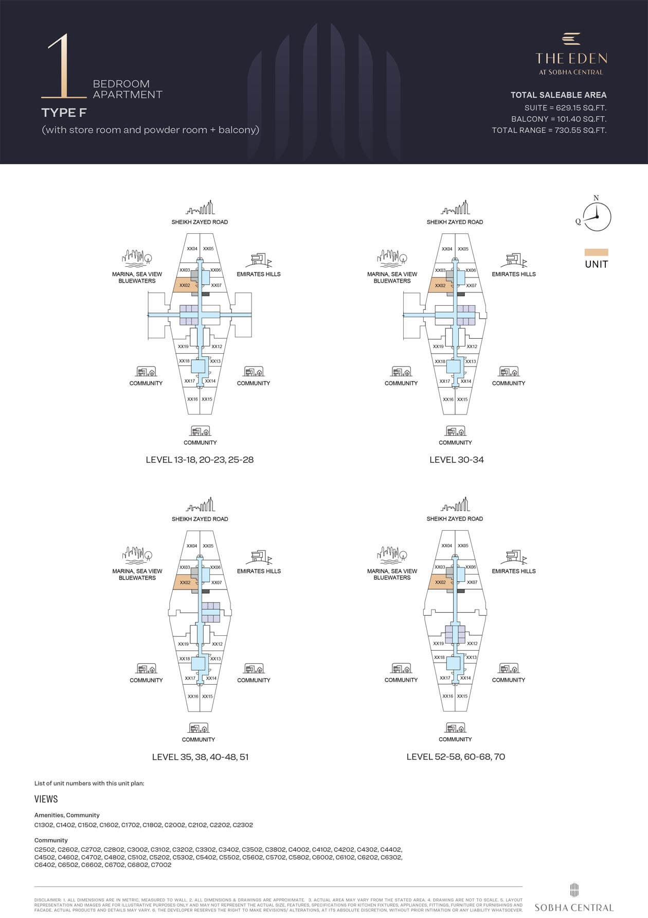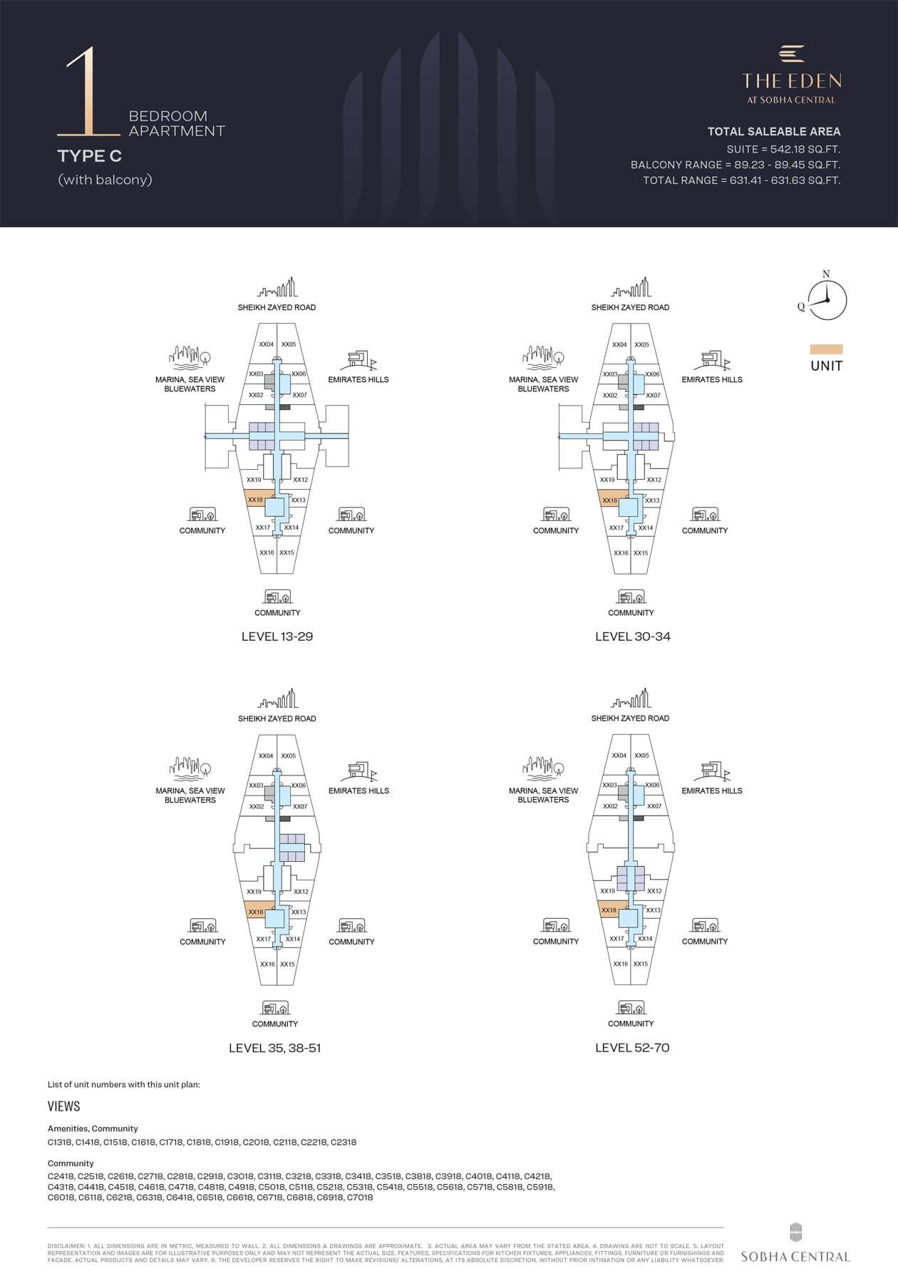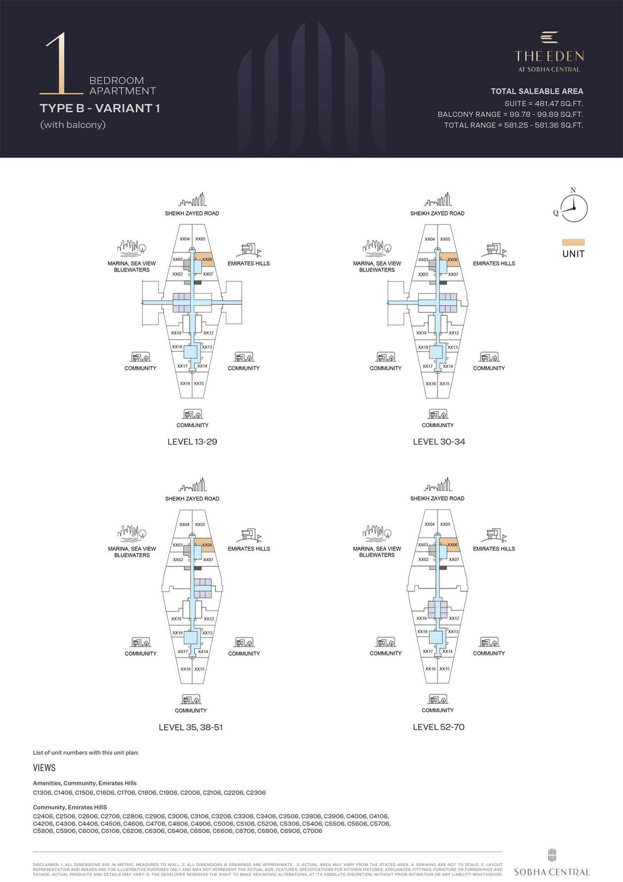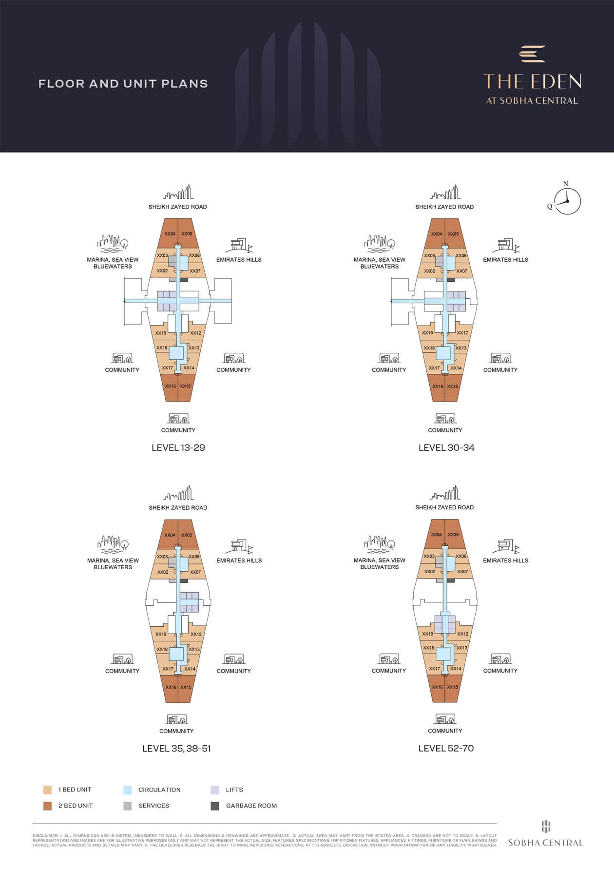 The Eden at Sobha Central consists of 1 and 2-bedroom luxury apartment units with exclusively crafted floor plans. Unit type is different, and some room plans have pounders, hot-water supply rooms, or storages to be more practical. Each apartment boasts generous living spaces, modern kitchens, stylish rooms and large balconies, with breathtaking views of Dubai, Emirates Hill or of the Arabian Gulf.