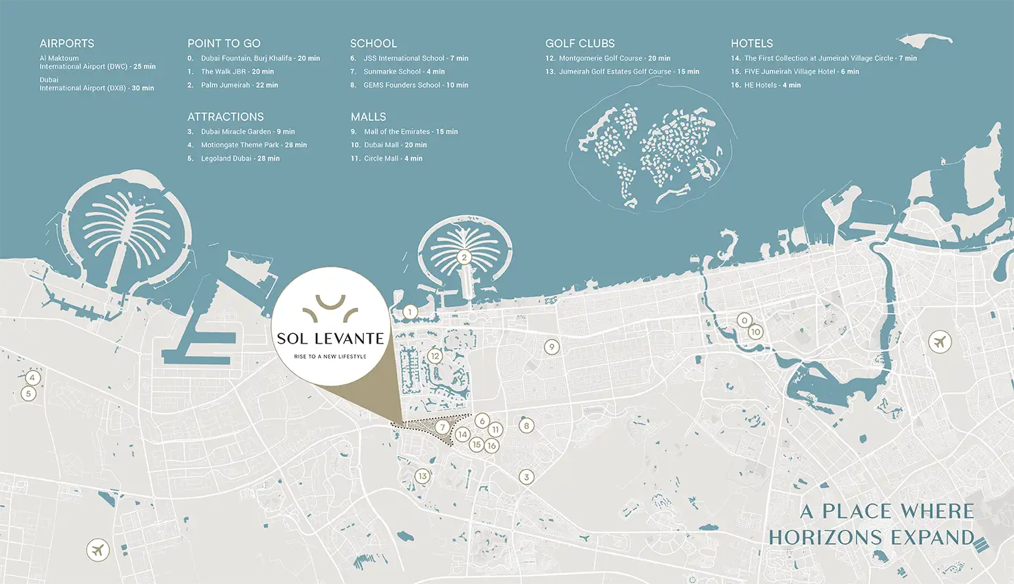 Sol Levante is located within the Jumeirah Village Triangle (JVT) that is renowned for offering a mix of villas, townhouses, and apartments. The prime location of this area allows easy access to major highways such as Al Khail Road and Sheikh Mohammed Bin Zayed Road, that ensures that residents can reach to key destinations of Dubai such as Dubai Marina, Downtown Dubai, Palm Jumeirah and Dubai Miracle Garden. It also offers easy connectivity to international airport which ensures that travel to any part of the world is hassle-free.