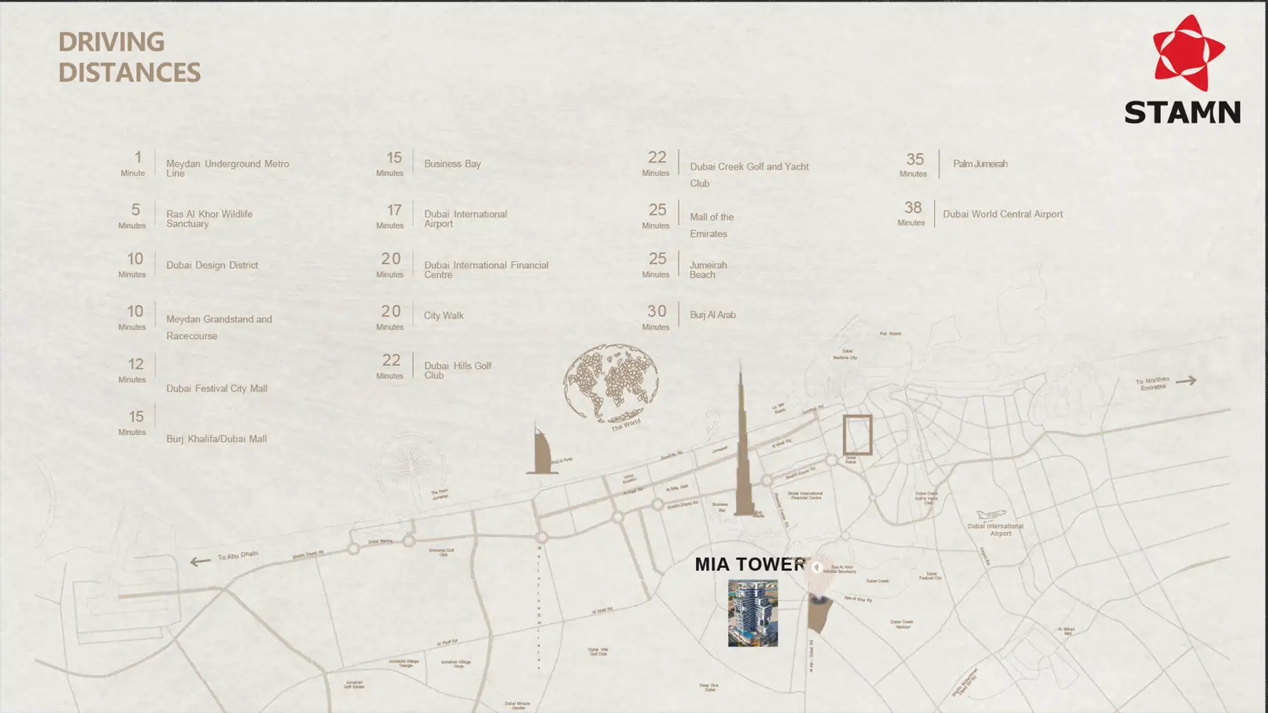 Stamn Mia Tower is well located in a place that makes everyone experience a modern and connected urban lifestyle in Meydan, Dubai. This community is expanding and growing day by day showing a mixed-use destination in the Emirates. It provides an exceptional connectivity by connecting all the key destinations of Dubai. The Meydan Metro Line is just 1 minute away, ensuring fast city access. One can reach to Dubai International Airport in 17 minutes, and Dubai World Central Airport is only 38 minutes away. Iconic attractions such as the Burj Khalifa, Dubai Design District, Burj Al Arab are just a few minutes away. Leisure hotspots including Palm Jumeirah at 35 minutes that offer convenient access to Dubai’s most celebrated landmarks.