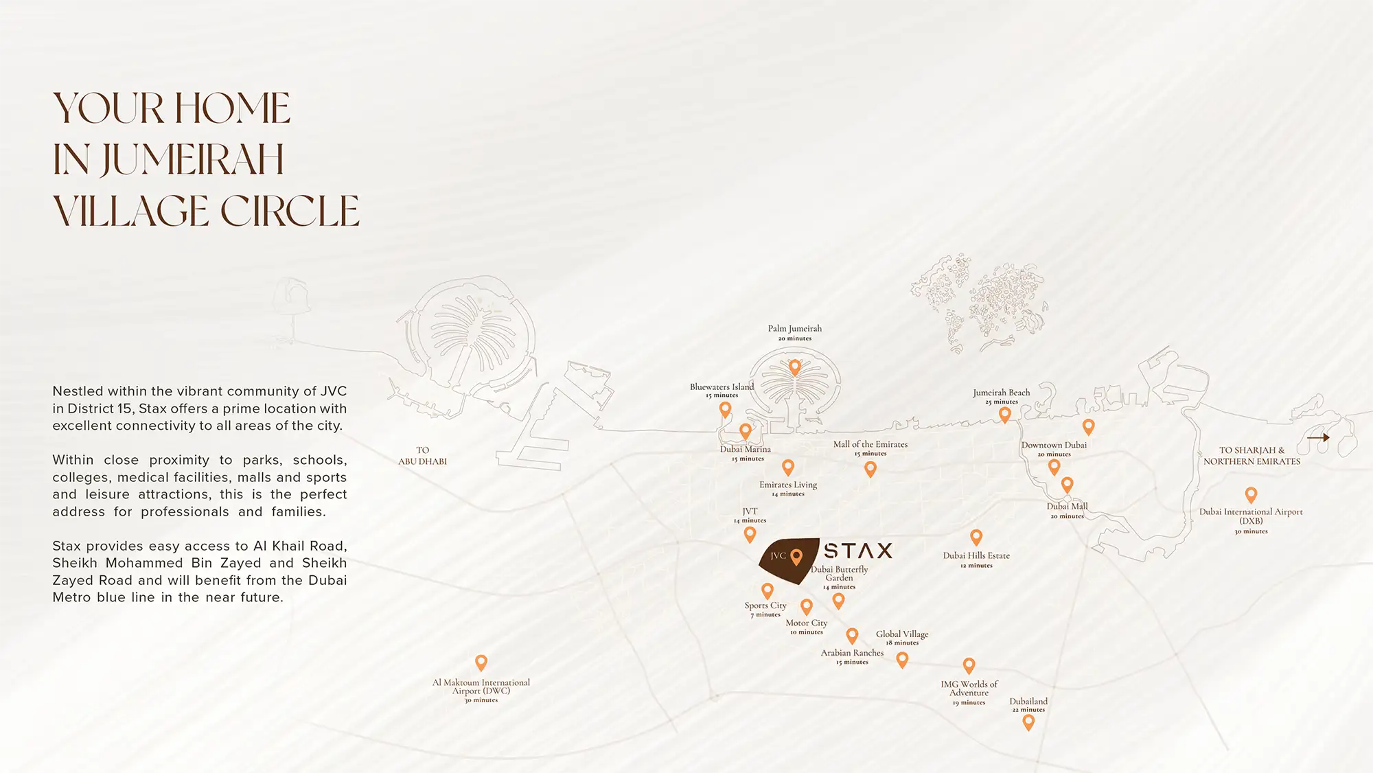 Stax Tower is ideally situated in Jumeirah Village Circle (JVC) a desirable residential destination of Dubai. It is home to some of the city’s best metropolitan connectivity, with Dubai Marina, Downtown Dubai and Business Bay just moments from home. Students are near schools, shopping, restaurants and entertainment while they enjoy the charming calmness of a family community with tree-lined streets and parks. This excellent location offers the peace of suburban life, with quick connectivity to the city attractions - an opportunity not to miss for both home buyers and investors.