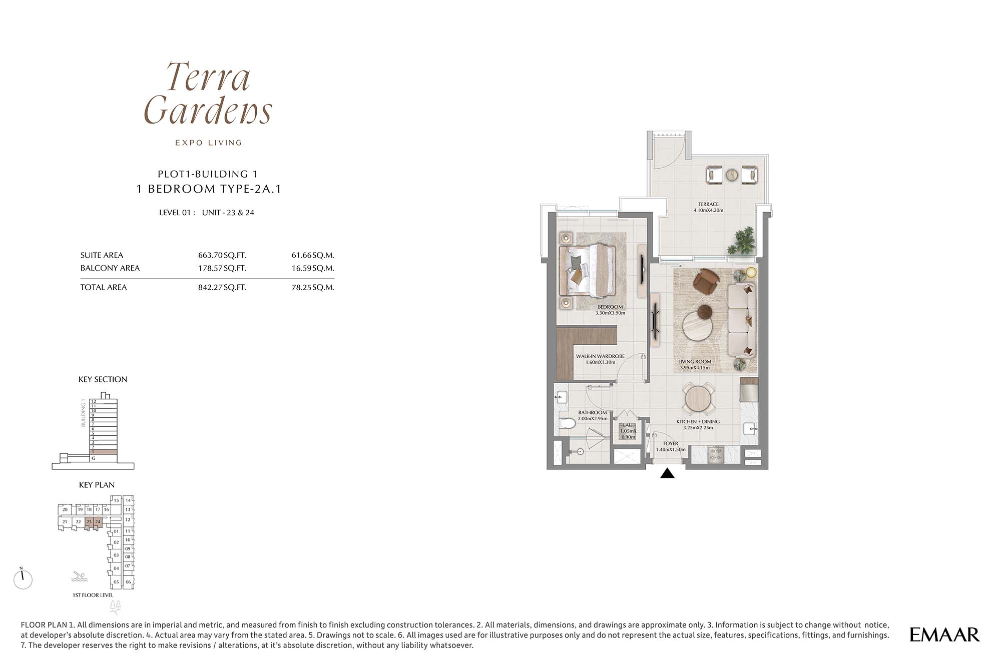 | Buildings 1 | 1 Bedroom | 1st Level Unit-23 & 24 (Type-2A.1) | 842.27 Sq Ft | Apartments |